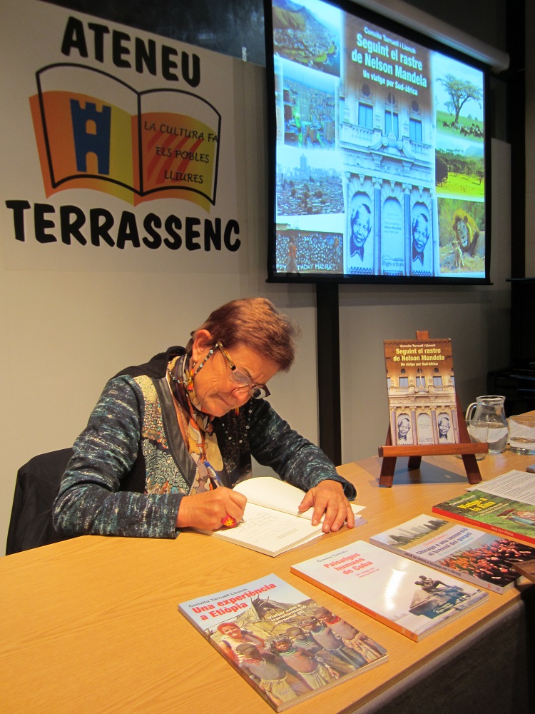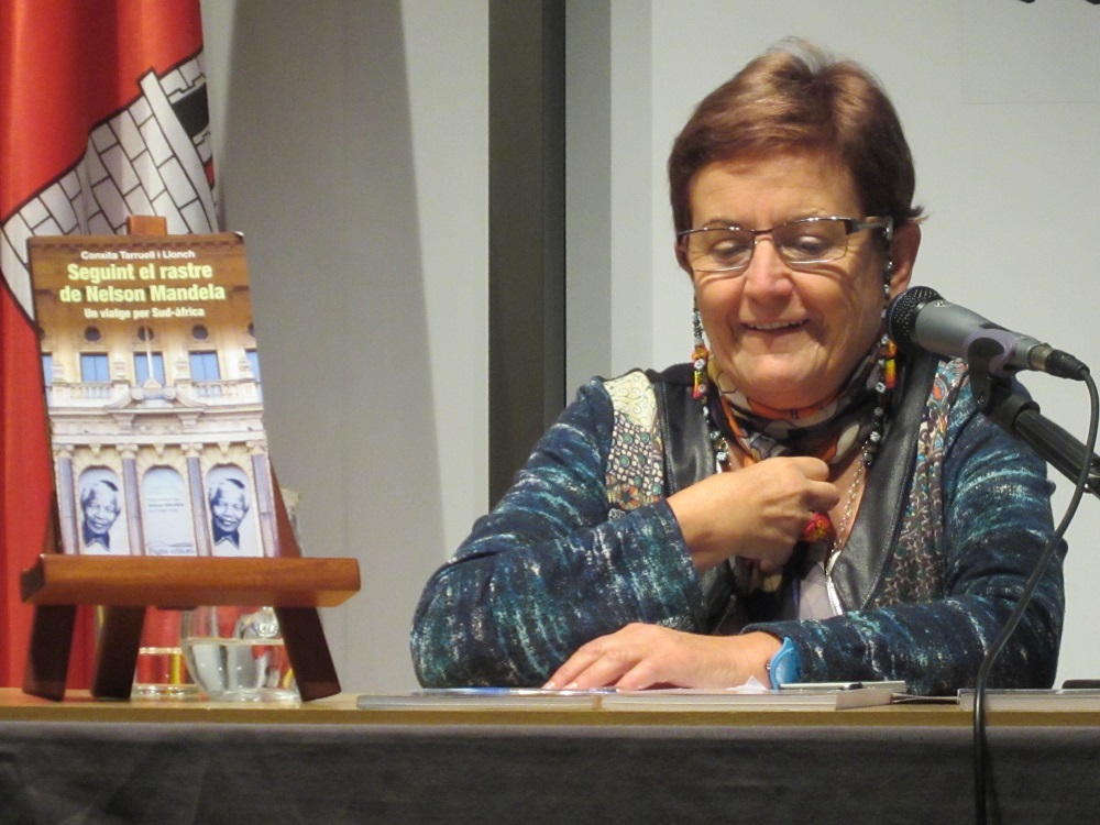 L’escriptora Conxita Tarruell ha presentat el seu llibre “Seguint el rastre de Nelson Mandela. Un viatge per Sud-àfrica” a l’AteneuDe vegades les grans conseqüències dels nostres actes poc tenen a veure amb les nostres intencions. La Conxita Tarruell i la Rosa Pi tenien interès en millorar les habilitats en llengua anglesa i van pensar que a Sud-àfrica era un bon lloc. Poc sabien dels avatars que els hi esperaven.Inicialment la Ciutat del Cap, la segona ciutat de Sud-àfrica i molt a prop del Cap de Bona Esperança va ser el seu destí. Una ciutat que per dimensió, clima, amabilitat i orografia els hi va recordar molt a Barcelona.Des de la Muntanya de la Taula, farcida de flors, es visualitza la ciutat, una de les mes boniques del món. Des d’aquella alçada sovint els parapentistes es llencen al vuit i arriben a la platja. Un actiu port era el punt on històricament fondejaven les embarcacions provinents d’Àsia que encara no disposaven del Canal de Suez.Una reserva al nord-est del país, el Parc Kruger on es poden visualitzar els grans mamífers com el rinoceront, l’elefant, el lleopard o el búfal, i encabat les visites a les ciutats Johannesburg i Pretòria construeixen la amena exposició i les imatges de la presentació corresponent als tres primers capítols del llibre «Seguint el rastre de Nelson Mandela»La última part de la presentació es centra en la visita de la presó on va estar confinat en una cel·la de ínfimes dimensions, les vivències compartides amb les últimes setmanes del gran humanista africà i la mobilització social al voltant del hospital on estava ingressat. Això va ser el que va animar a plasmar en un llibre el recull d’aquestes experiències i el llegat de Mandela.La relació amb l’arquebisbe anglicà Desmond Tutu guardonat en el 2014 amb el Premi Internacional de Catalunya que va acabar d’animar a la Conxita va acabar el llibre que avui s’ha presentat a l’Ateneu Terrassenc.