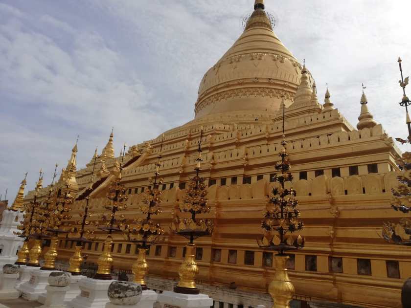 La pagoda daurada de Shwezigon, té uns nou cents anys antiguitat i brilla com un far en mig de la plana. Està situada  a la riba del riu i és un dels quatre punts cardinals de Bagan. Té relíquies de Buda i es veu la campana daurada amb una alçada de gairebé cinquanta  metres.