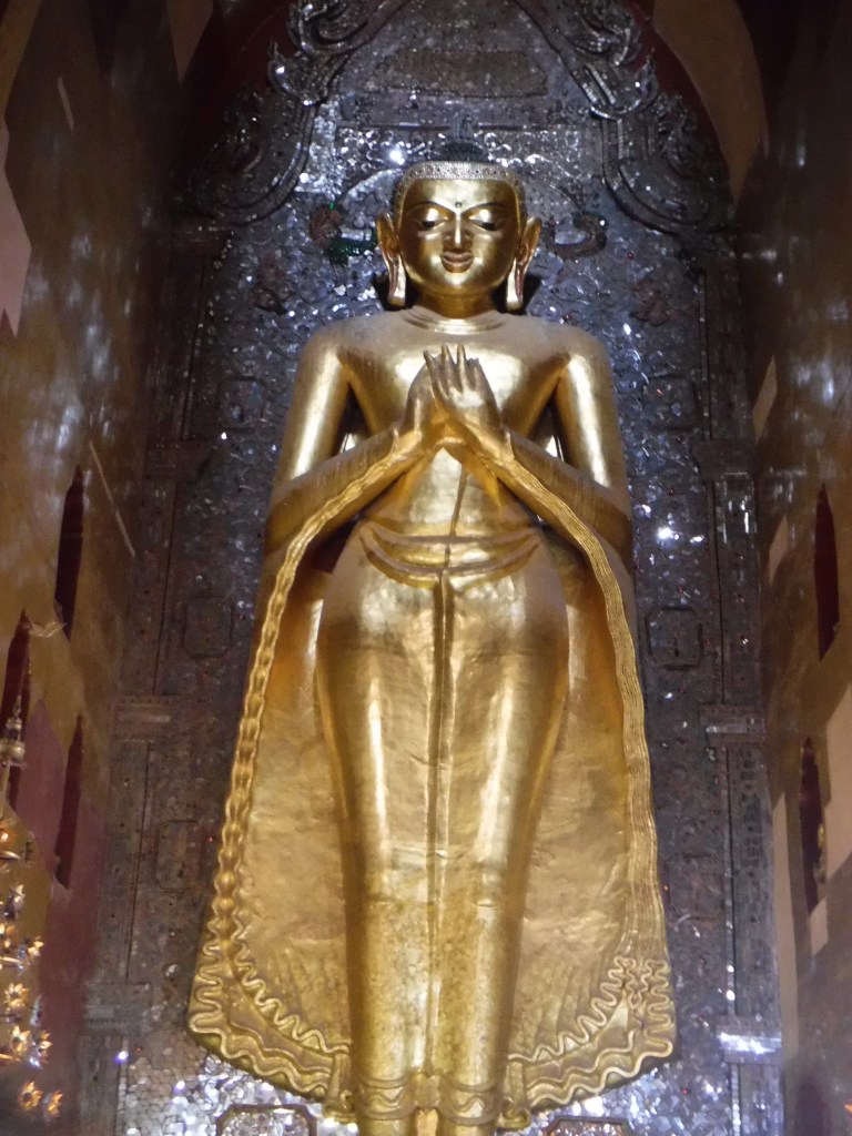 El temple d’Ananda  que significa molt bonic, és un dels mes impressionants. A l’interior està rodejat de passadissos  i acull quatre estàtues de  budes de peu, cadascuna d’elles orientada cap a un punt cardinal.  El seu aspecte de color daurat podria fer pensar que són de metall,  però estan construïdes en fusta de teca massissa.  Aquest Temple pot ser considerat com un museu en si mateix a causa de la quantitat d’expressions artístiques, que van ser utilitzades durant la seva construcció i ornamentació.