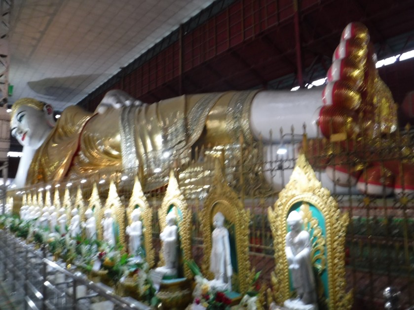 Quedo admirada en veure el gran Buda reclinat a la Pagoda Chauk Htet Gyi. Es presenta relaxat totalment contrari al estil del Buda mort on el cap reposa en un coixí. La planta dels peus està gravada amb els famosos 108 lakshanas o atributs de Buda que el diferencien dels homes.