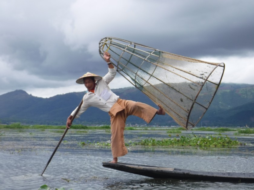Fem un recorregut en barca pel  llac i quedo  sorpresa  de la forma que tenen de pescar. Han desenvolupat l’habilitat de remar amb un moviment circular del peu, alhora que manegen les xarxes de pescar amb les mans. Colpegen l’aigua amb els rems, intenten que els peixos vagin  directes a la xarxa. Els peixos es  mantenen  vius en unes gàbies per portar-los al mercat.