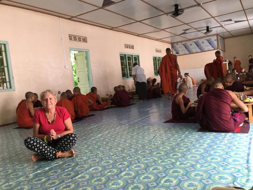 Pugem fins al turó on hi ha el monestir Mai Thauk Taw Ya, són les onze del matí, l’hora de dinar, sona la campana i  de sobte baixen per les escales tota una colla de monjos, alguns molt petits. Ens deixen entrar al menjador i veiem com dinen en silenci. És l’únic àpat que fan al dia que consisteix en un bol de sopa i arròs.