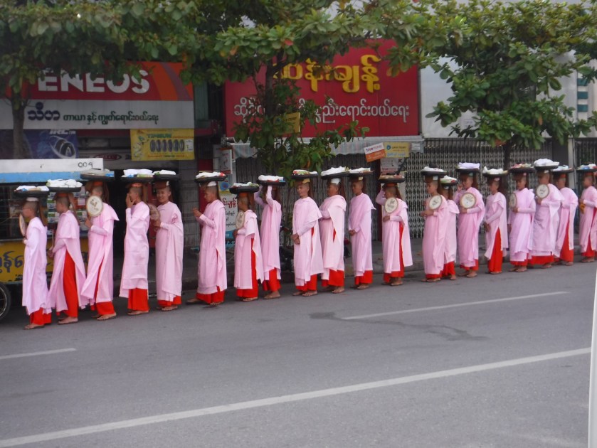 Al costat de la carretera trobem unes monges que surten per demanar almoina, però no poden rebre menjar cuinat. Els ofereixen diners, arròs i tot tipus d’aliments que elles puguin cuinar.  Els convents de monges procuren també un refugi a les joves sense recursos per sobreviure.