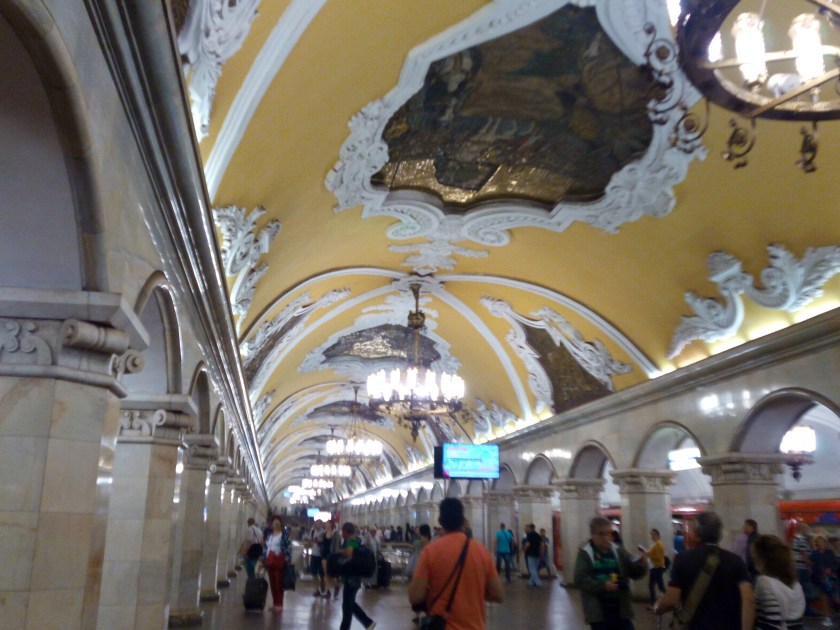 El Metro de Moscou, també conegut com el Palau de poble. La primera línea de metro es va estrenar l’any 1935 i per la construcció hi van treballar molts voluntaris. En l’actualitat compta amb dotze línees i cent setanta estacions. Els passadissos subterranis semblen un museu, ja que estan decorats amb un  veritable luxe de conte de fades. He quedat al·lucinada de la grandària de cada estació i de com estan adornades amb pintures murals, escultures i vidrieres de colors.
