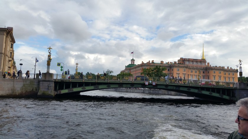 Naveguem amb vaixell pel riu Neva i els canals fins arribar al mar Bàltic. M’ ha encantat veure els voltants del riu, amb grans edificis i jardins. Hem passat per sota els ponts, alguns s’obren quan passen els grans vaixells. He vist el vaixell Aurora i també he reconegut l’ agulla daurada que sobresurt  de la Fortalesa de Sant  Pere y  Sant Pau. Durant tota la travessia hem vist un noi que ens saludava des de cada pont que passàvem, ens ha estranyat que ens seguís, però ens diuen és una costum que tenen per guanyar alguns  diners,  corren d’un pont a l’altre perquè quan  arribem els hi donem una propina.