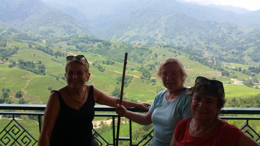Caminamos unos diez kilómetros por el valle y las montañas de Sapa, nos sigue un grupo de mujeres y niños. Conocemos otras etnias minoritarias. La excursión es agotadora, pero vale la pena disfrutar de las vistas del paisaje sobre el río.