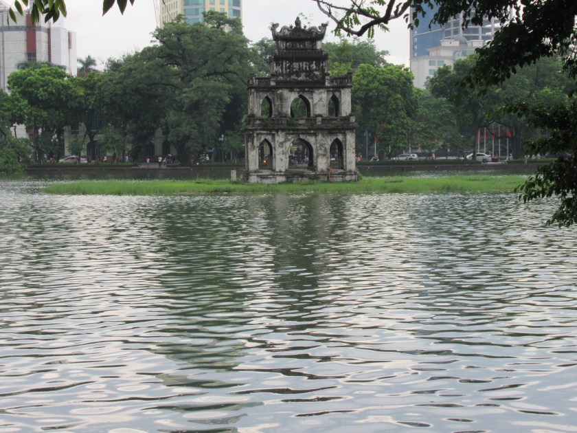 El paseo por el Gran Lago ofrece unas vistas relajantes en medio del caos. Antes fue parte del río Rojo, hasta que se cambió el curso del río hace unos mil años, poco antes de la fundación de la ciudad. En el lago vemos la Torre de la tortuga, símbolo de Hanoi, cubierta una parte por el agua.