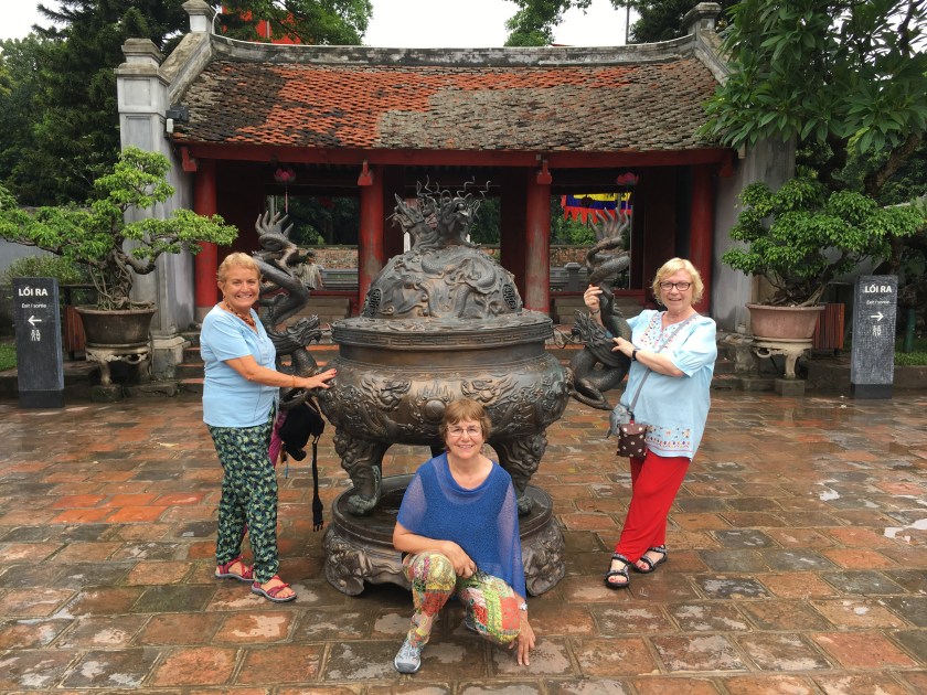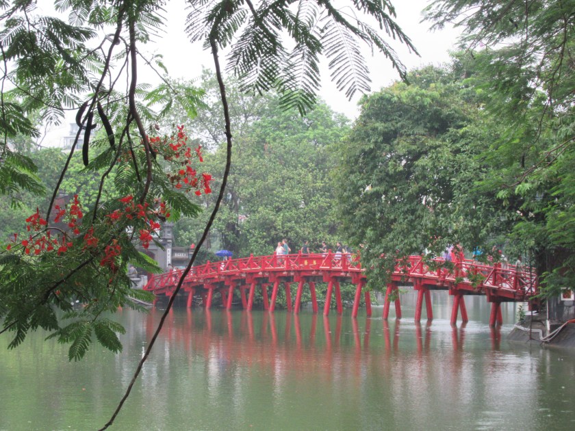 Desde el Puente Rojo junto al Gran Lago se puede ver gente que pasea, o hacen chi kung, tai-chi y estiramientos. Llueve muy fuerte y quedamos empapadas. También vemos la Torre Hoa Phong, la única que queda de la gran pagoda Bao An, que fue destruida en 1898 por la planificación urbanística y  se ha dejado en pie como recuerdo.