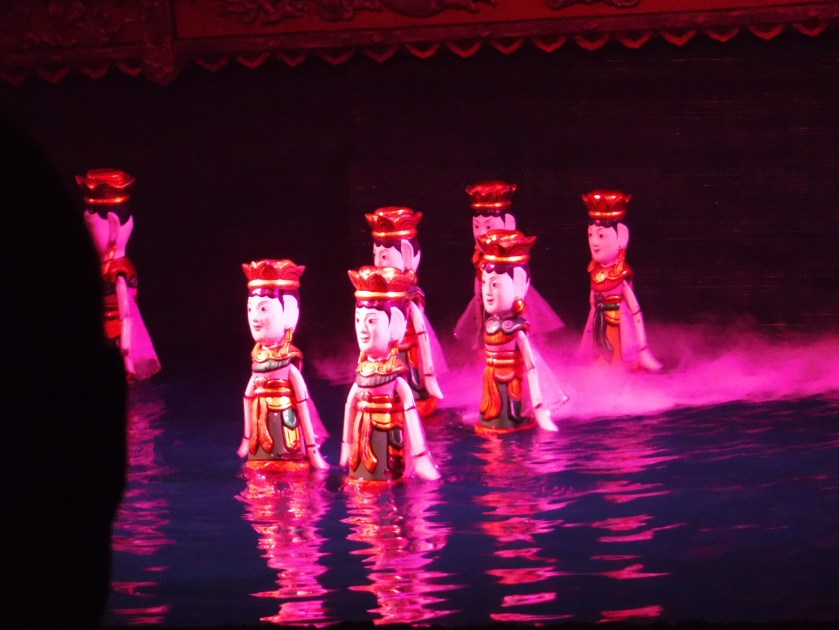 El espectáculo de marionetas de agua me impresiona, porque los titiriteros están dentro del agua. Representan y cuentan historias de la vida cotidiana en el campo.