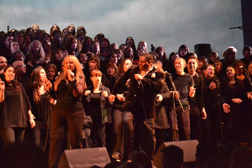 Son muy fuertes también las emociones que viví. Whitman contagió su entusiasmo a los doscientos cincuenta cantores que seguían el ritmo con armonía en el escenario. Se creó una buena conexión con los mil doscientos espectadores convertidos en parte activa del concierto, que imitaban el canto y los movimientos. Cuando vi las lucecitas de los móviles que se iban encendiendo que salían del público, me transporté a los conciertos de mi juventud. La energía positiva de la música transmitida con la unión de todos, me conectó con los valores de paz, fe, amor, tolerancia, solidaridad, compromiso y respeto.