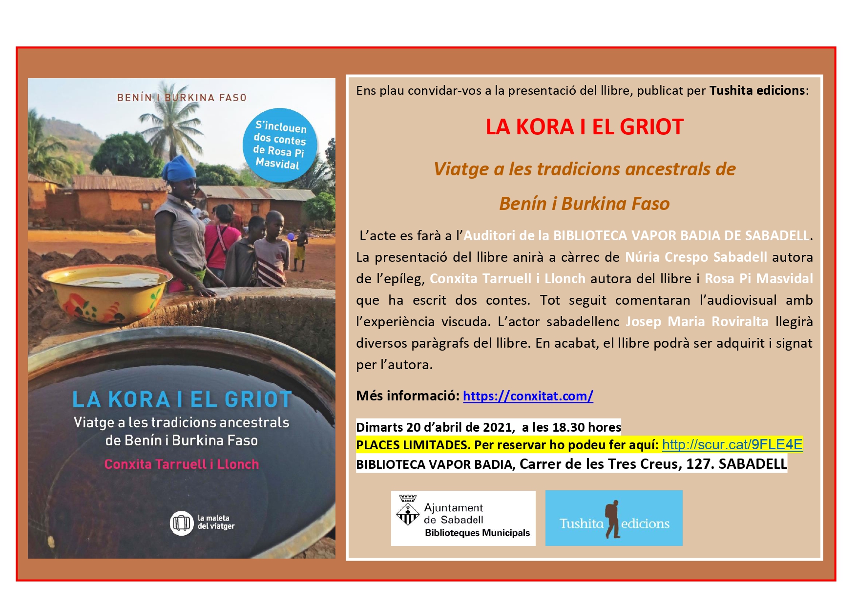 Àfrica enamora! Voleu fer un viatge virtual per Benín i Burkina Faso i endinsar-vos pels pobles i ètnies? Ho podreu fer a través del llibre LA KORA I EL GRIOT de Conxita Tarruell amb contes de Rosa Pi. Veniu a la Biblioteca Vapor Badia de Sabadell el dimarts 20 d’abril a les 18.30h.