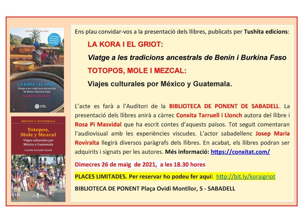 Per altra banda si voleu participar presencialment us convidem el dimecres 26 a les 18.30h a la Biblioteca de Ponent de Sabadell. Podreu transportar-vos a països de l’Àfrica i d’Amèrica a través d’imatges i lectures dramatitzades dels llibres: TOTOPOS, MOLE I MEZCAL i LA KORA I EL GRIOT. Hi ha places limitades, de manera que si us engresqueu us haureu d’apuntar per reservar lloc en aquest enllaç http://bit.ly/koraigriot o bé apuntar-se a la BIBLIOTECA DE PONENT Plaza Ovidi Montllor, 5. SABADELL