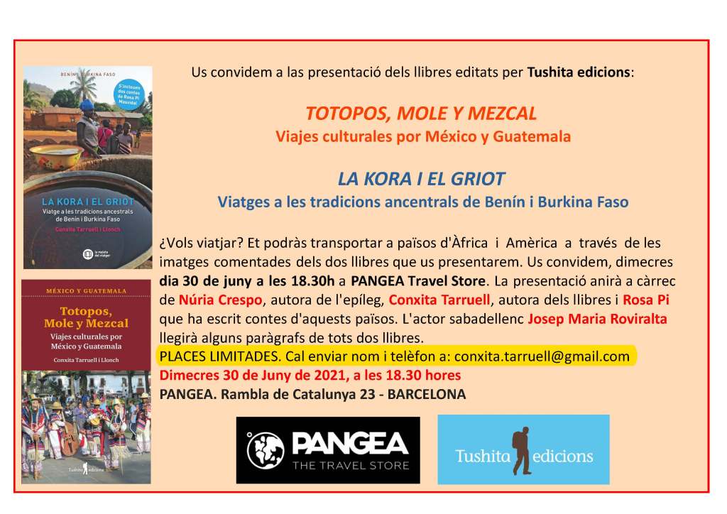 Ens vols acompanyar el dimecres 30 de juny a les 18:30h a PANGEA Travel Store? T’agradarà, és la tenda de viatges més gran del món, situada en ple centre de Barcelona. Si vens, podràs viatjar virtualment a països d’Àfrica i d’Amèrica a través dels llibres LA KORA I EL GRIOT i TOTOPOS, MOLE I MEZCAL. Les places són limitades. Per reservar necessitem el vostre nom cognom i telèfon. Ens ho podeu enviar aquí: