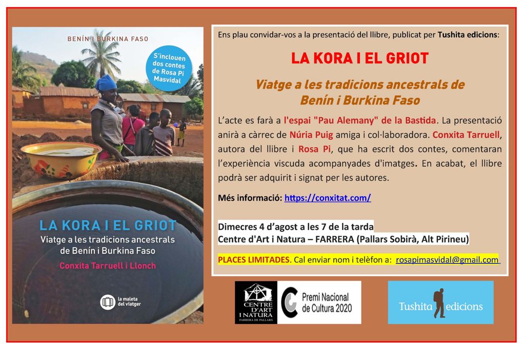 A la presentació del llibre LA KORA I EL GRIOT a Farrera, el 4 d’agost, ha obert l’acte Lluís Llobet, director del Centre d’Art i Natura. Núria Puig. amiga i col·laboradora, ha parlat sobre les autores i el llibre. Miracle Sala i Farré, escriptora, ha llegit fragments sobre el Viatge a les tradicions ancestrals de Benín i Burkina Faso. acompanyades d’imatges que comentaven Conxita Tarruell, autora del llibre i Rosa Pi, que ha escrit dos contes. El públic ha estat nombrós i en acabar ha participat en un col·loqui enriquidor.