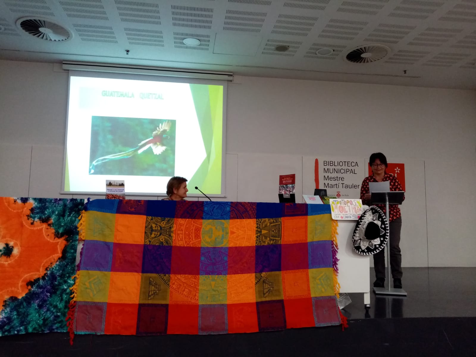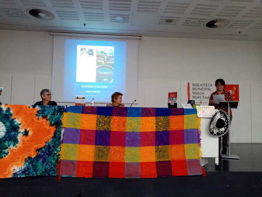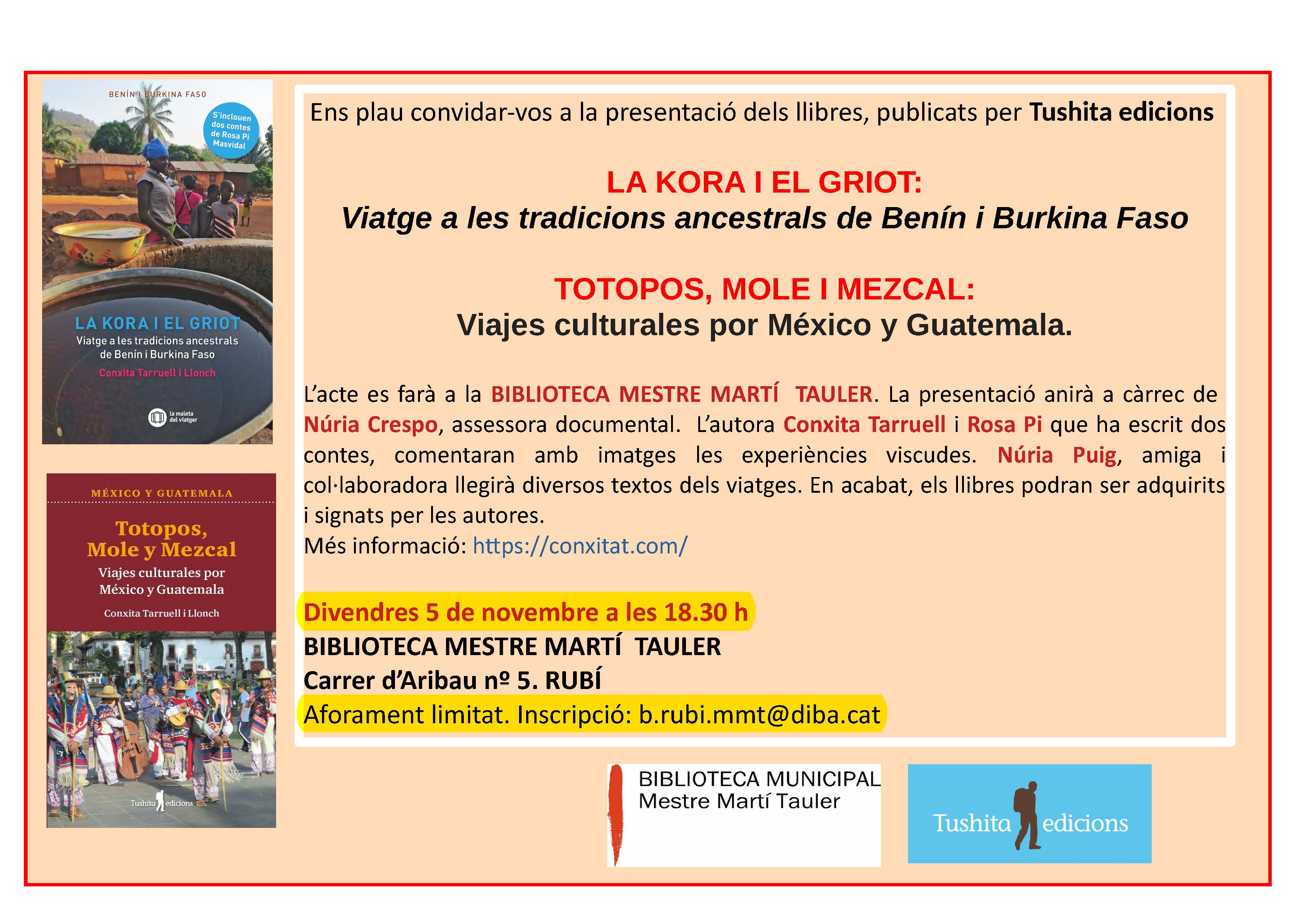 Avui divendres 5 de novembre, a la biblioteca de Rubí s’ha presentat els dos darrers llibres , sobre Mèxic i Guatemala, i Benín i Burkina Faso, de la Conxita Tarruell amb un públic participatiu. La Núria Crespo ha introduït l’acte parlant dels significats dels títols dels llibres: Totopos, Mole y Mezcal, i la Kora i el Griot. L’autora ha explicat el motius que l’han portat a viatjar a aquests països. La Rosa Pi ha parlat dels seus contes inspirats en ambdós continents. La Núria Puig ha fet una lectura d’alguns fragments extrets dels llibres, acompanyada d’imatges. A l’acabar l’acte els assistents han preguntat amb molt interès qüestions relacionades amb aquests territoris. S’ha produït un petit col·loqui en un ambient distès. El públic ha adquirit els llibres que les autores han signat.