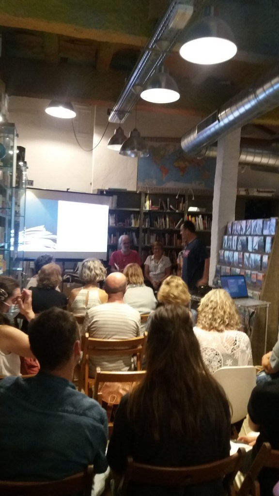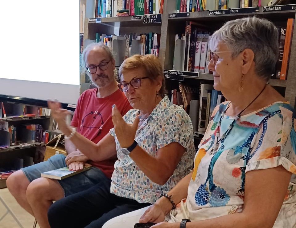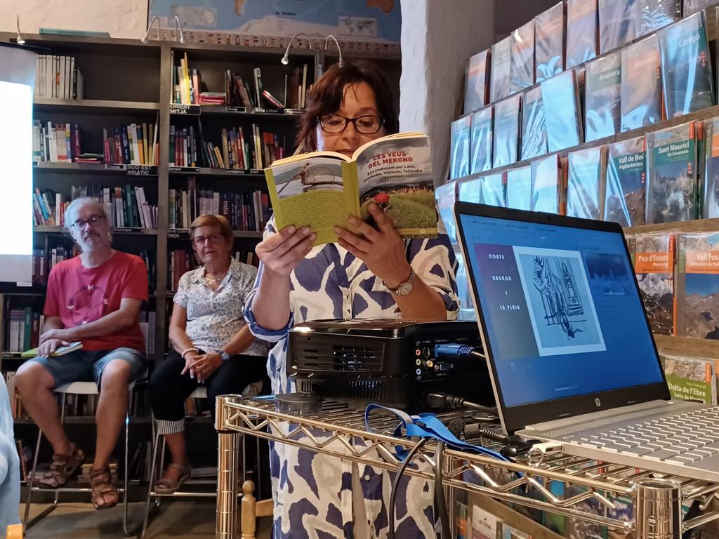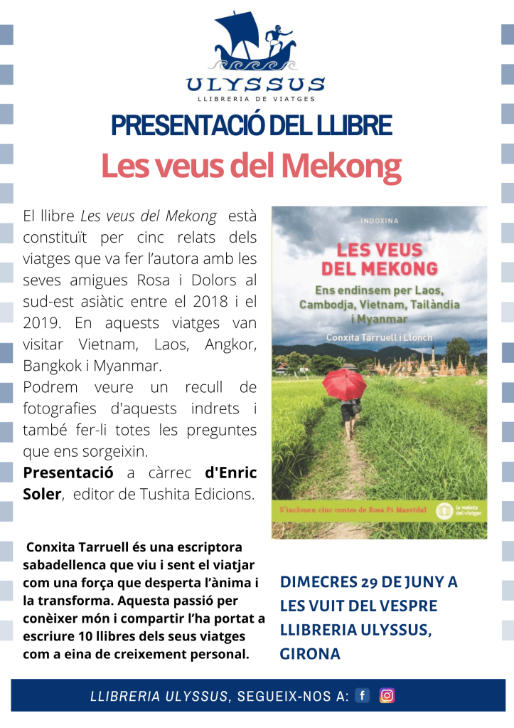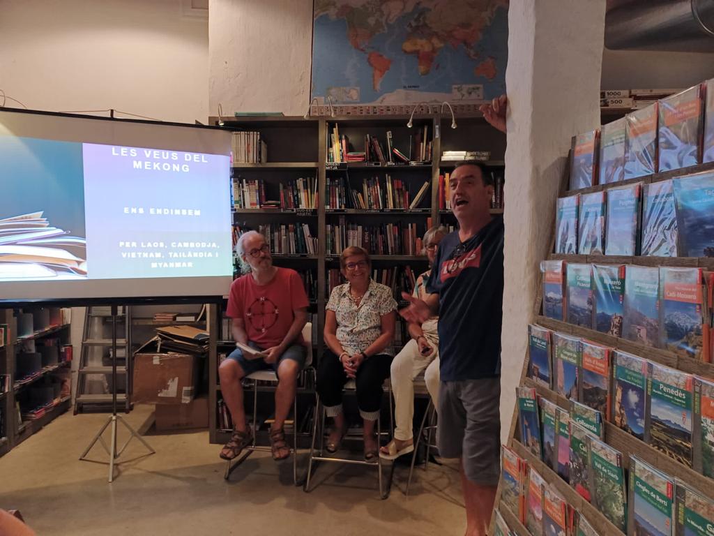 Èxit d’afluència del públic gironí que va omplir l’espai reservat a la presentació del llibre Les veus del Mekong. Embolcallats per milers de llibres de viatges, va obrir l’acte el Josep Maria de la llibreria Ulyssus. L’editor del llibre Enric Soler va fer la presentació i les autores Conxita Tarruell i Rosa Pi van explicar amb vehemència les experiències viscudes a la península d’Indoxina amb fotografies molt representatives de la cultura d’aquests països. Es va llegir un fragment d’un dels cinc contes que inclou el llibre. Gràcies als organitzadors i a tots els assistents.