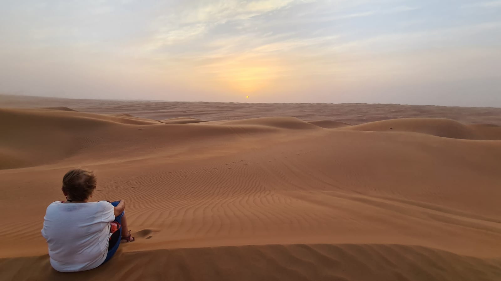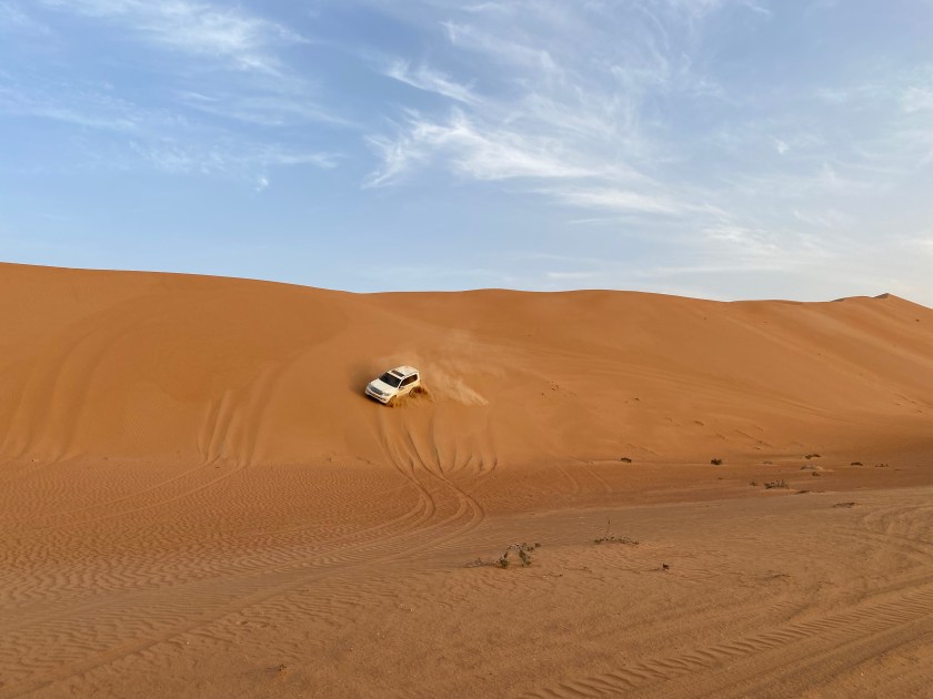 La aventura de atravesar las dunas en 4×4. Contemplo absorta las diversas tonalidades de los colores naranjas de la arena, como van cambiando. De repente, hacemos una bajada en picado y me sale un grito del alma. Subimos a una de las dunas más altas y la bajamos derrapando, y tal es la inclinación, que cuando miro a través del cristal de la ventana, la veo cubierta de arena.