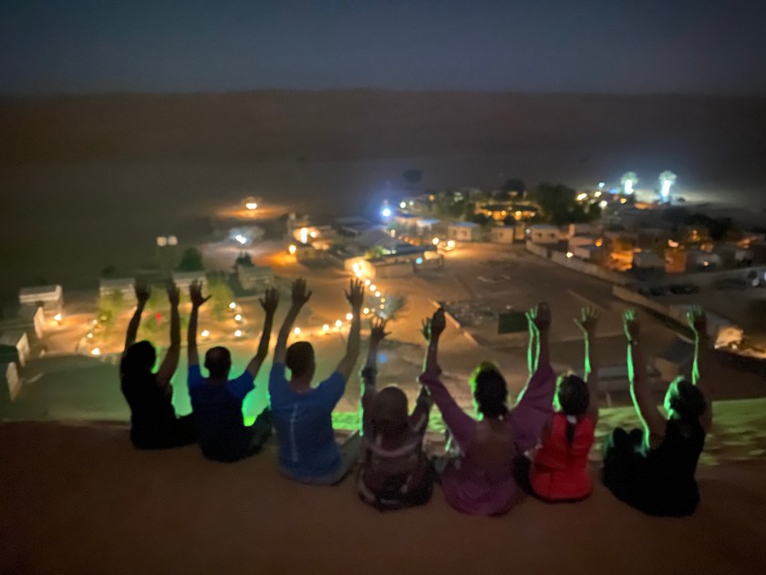 La satisfacción de conseguir llegar a lo alto de la duna por la noche. Todo gracias a mi esfuerzo y al apoyo que me dan los compañeros que ya han llegado. Qué sorpresa cuando tomamos una fotografía y vemos que todos salimos con una luz verde y nos da ataque de risa.