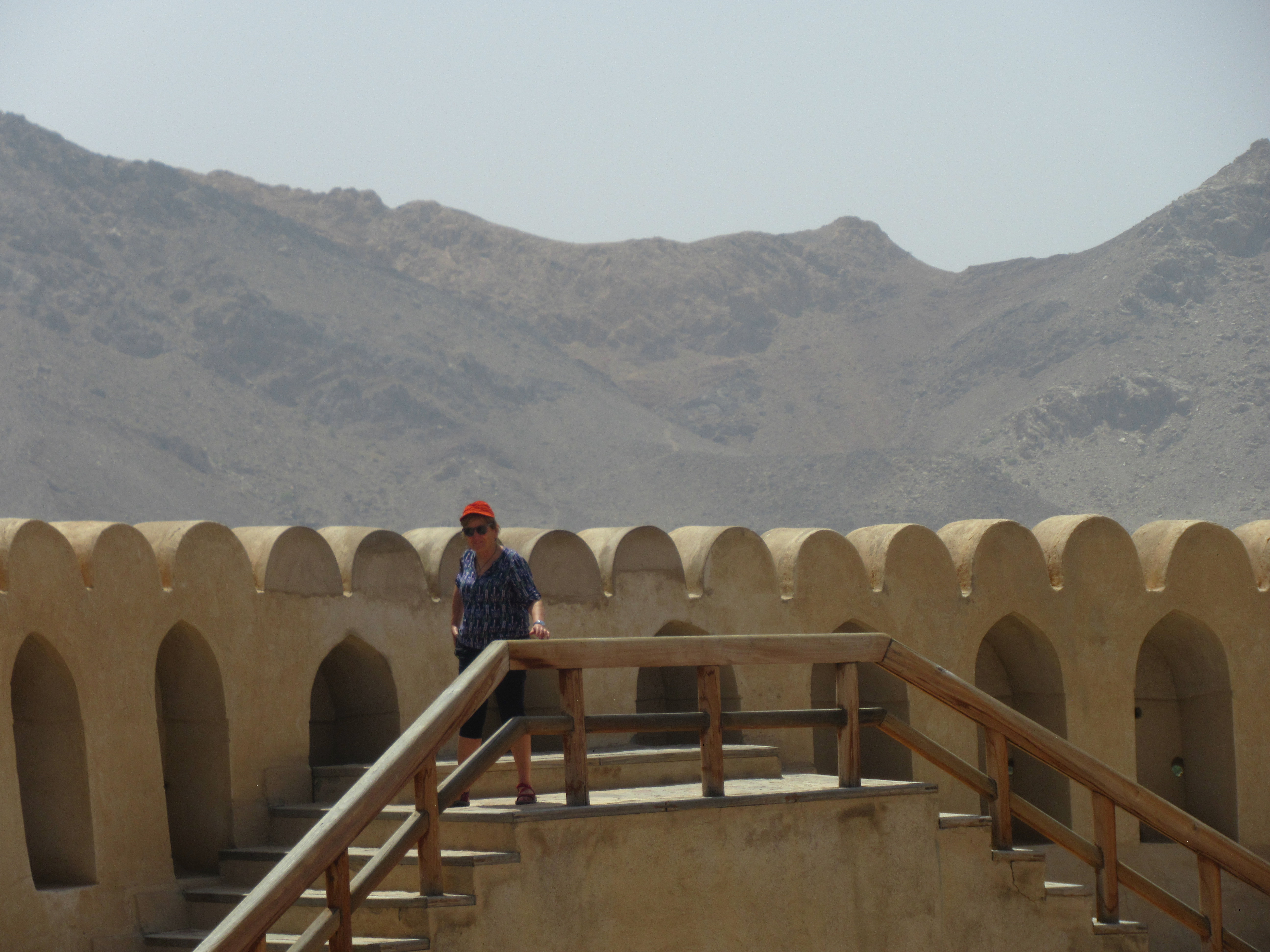 El Fuerte de Nizwa, se alza en el centro de la ciudad. Hemos subido a lo más alto donde se ve una panorámica de la ciudad, el palmeral y las montañas del fondo.