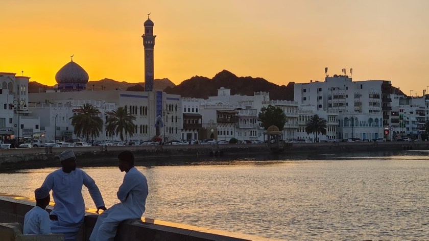 El paseo marítimo se conoce con el nombre de Corniche, en él sobresale la silueta de la cúpula de color azul de la Mezquita Chií de estilo iraní. Caminamos al atardecer y disfrutamos de la magia nocturna de las luces que se reflejan en el mar.