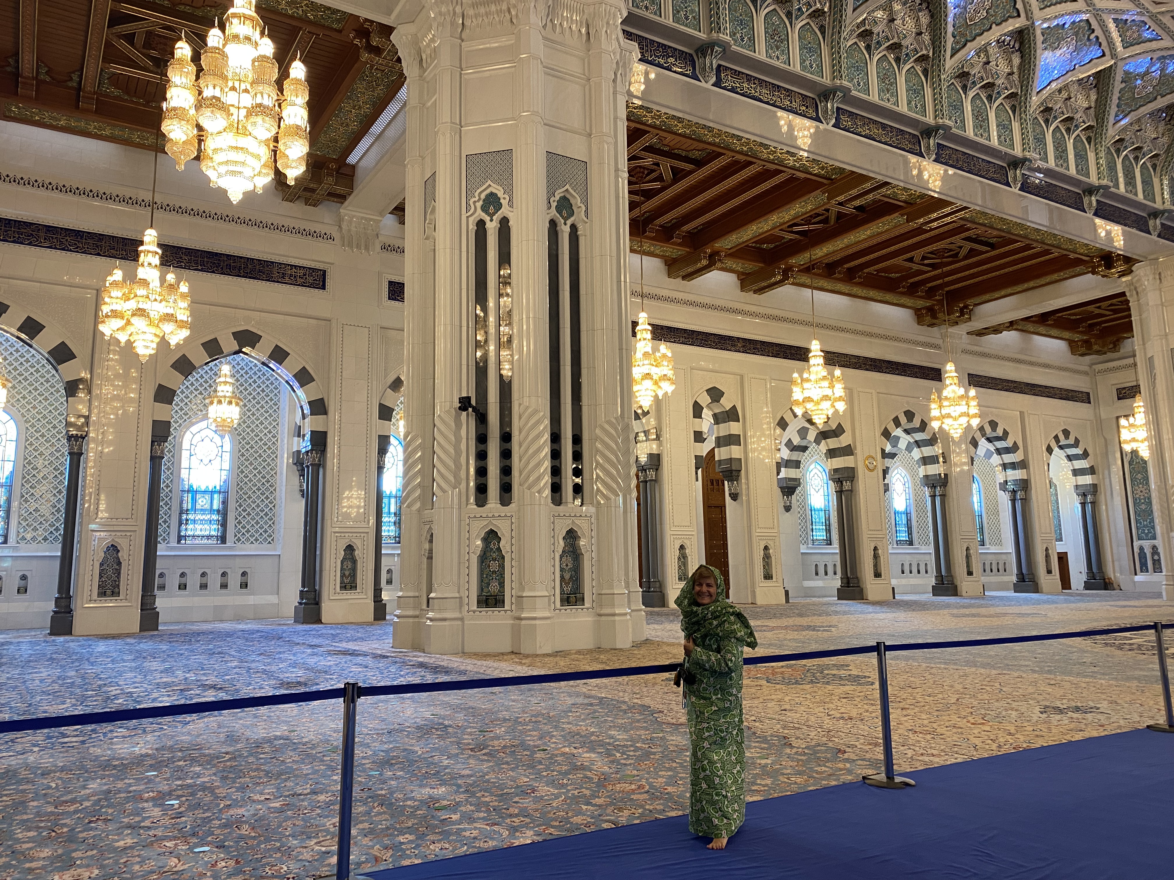 La Gran Mezquita del Sultán Al Qabbus, el monumento más emblemático de la capital es una obra maestra de la arquitectura islámica contemporánea. Está coronada por una cúpula dorada con blancas fachadas. En su interior, destaca una alfombra espectacular, tejida a mano, que es la segunda más grande del mundo. Un elemento decorativo importante son las lámparas de araña, elaboradas con cristales de Swarovski. Para entrar en la mezquita es obligatorio vestirse de largo. Aunque yo llevaba un vestido largo, me molestó que me llamaran la atención por el hecho de que transparentaba de rodilla hacia abajo. Me obligaron a comprar una chilaba, el traje típico del país.