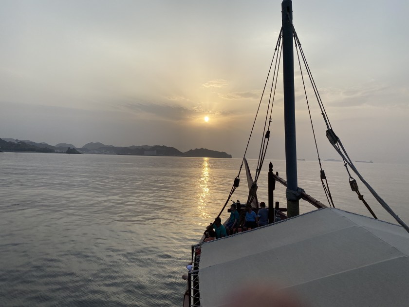 El paseo por el golfo de Omán con un dhow, barco de madera y sin clavos. En el atardecer mientras el sol se pone, la luna llena sale a saludar.