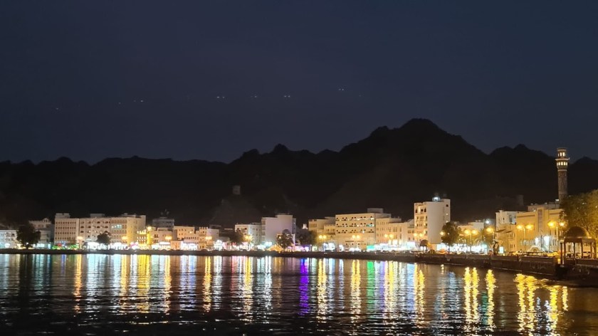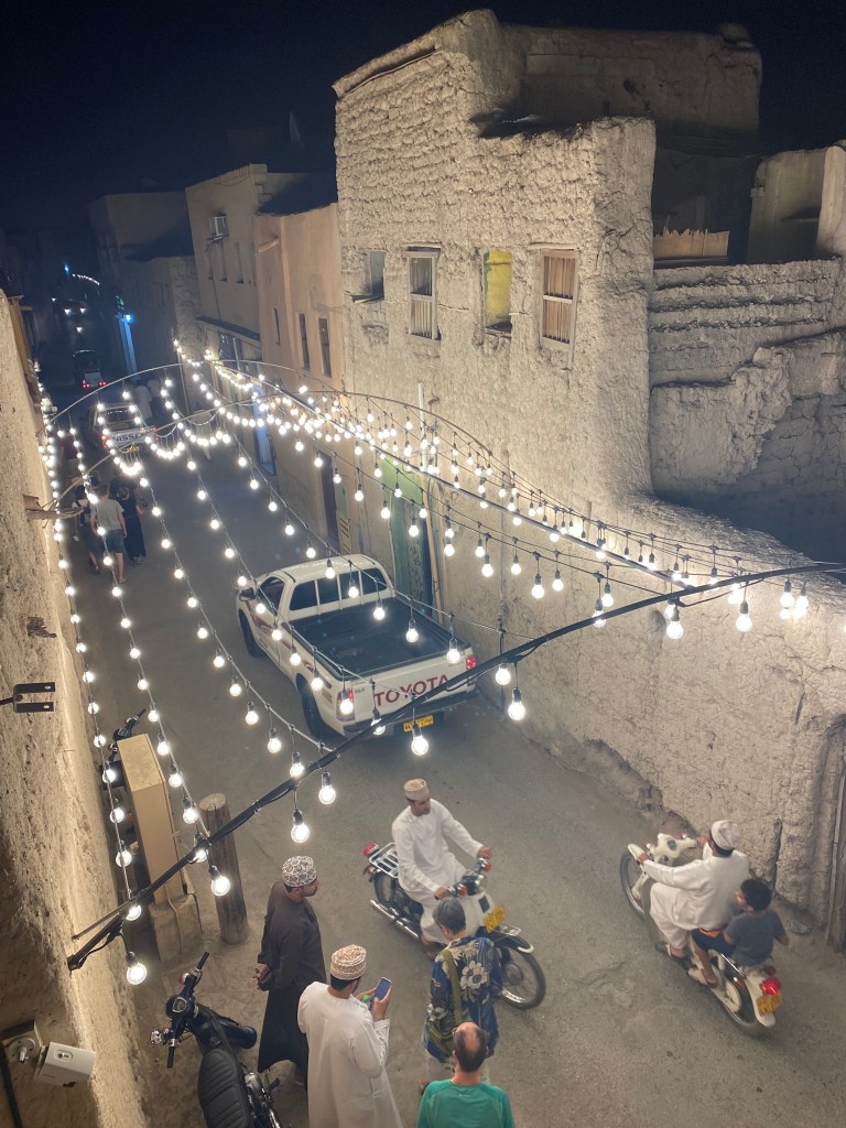 El paseo al atardecer por Nizwa donde hay mucho ambiente. Se ven familias con niños pequeños. Las chicas jóvenes van bien arregladas y los chicos las siguen embobados. Algunas calles están iluminadas con bombillas como si fueran luces de Navidad, con pequeñas lunas y estrellas. Entramos en un local nocturno, un sitio agradable. Allí he podido captar cómo se vive por la noche, sobre todo en tiempos del Ramadán. Al salir encontramos tráfico de motos y coches que van en dos direcciones, es complicado cruzar porque la calle es estrecha y no hay acera. Ha sido una buena aventura.