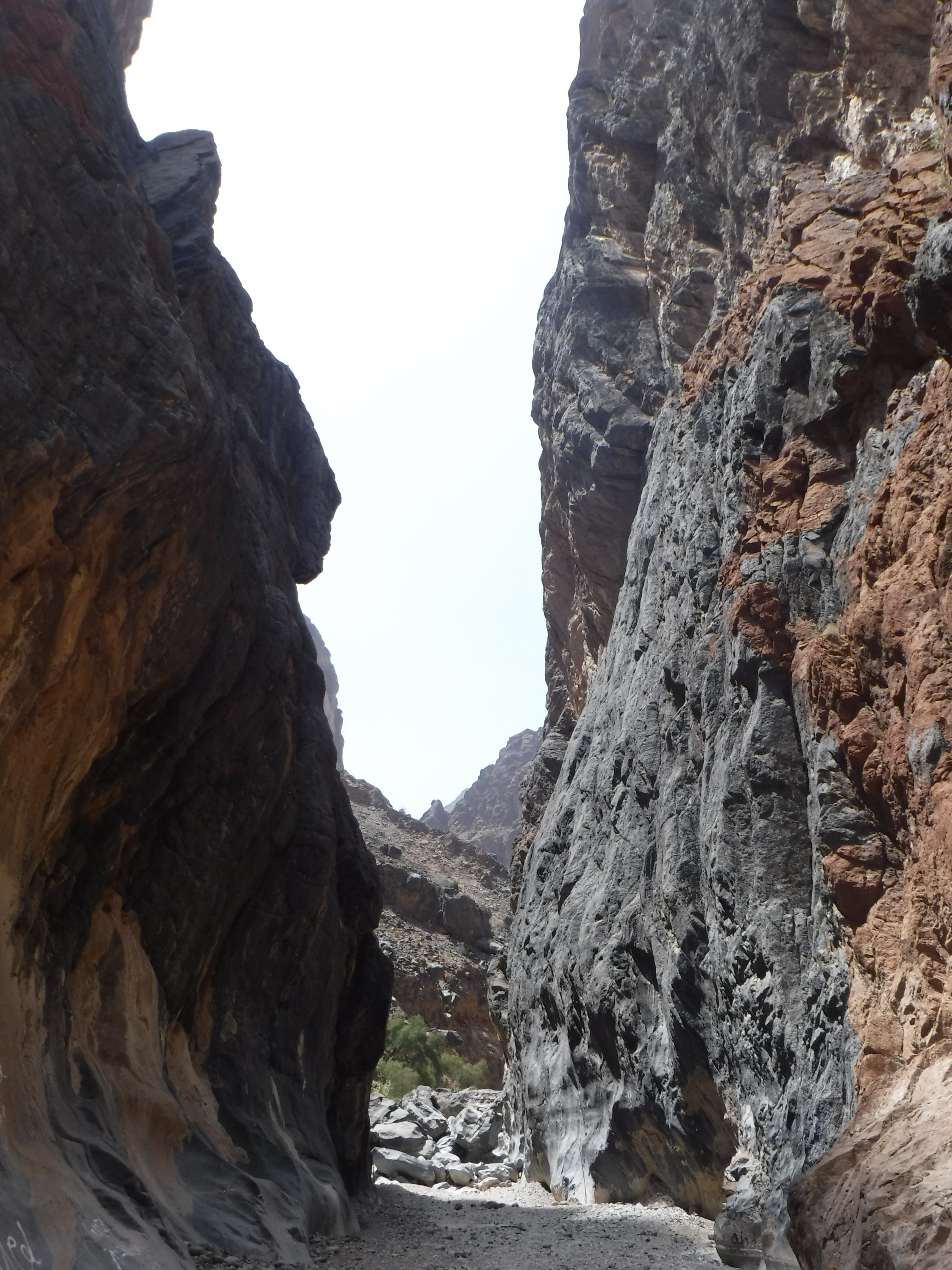 El camino que serpentea entre precipicios rocosos a través del valle seco de Wadi Bani Awf. Vamos con un todoterreno, nos detenemos y caminamos por el Cañón de la Serpiente, un desfiladero muy estrecho situado en medio del valle. Aquí hemos visto serpientes de agua delgadas y largas en un charco.