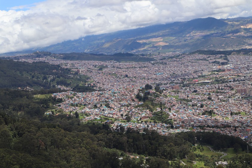 La vista de la ciudad de Bogotá a más de tres mil metros de altura. También me llevo la excursión con Carlos, que nos acompaña y subimos al funicular de Montserrate. Cuando llegamos oímos por todo el recinto los cantos de la misa acompañados con guitarras.
