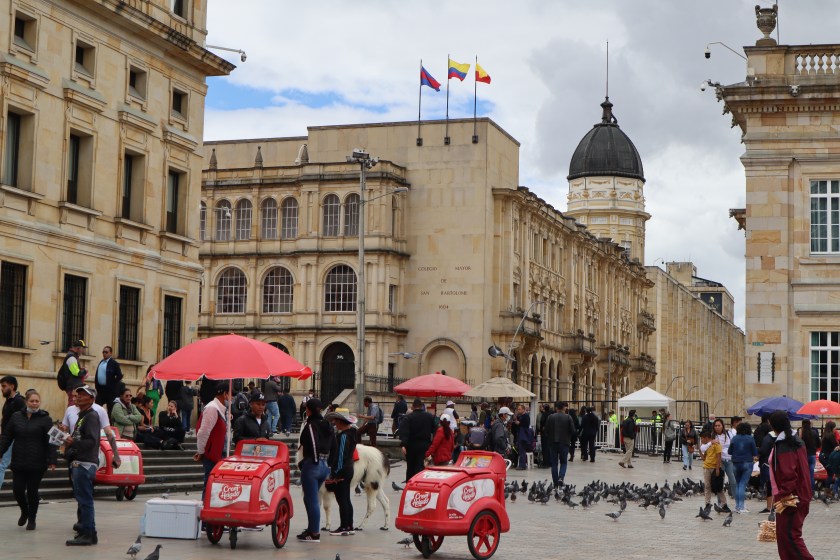 La plaza Bolívar está cerrada, porqué se està preparando la toma de posesión del nuevo presidente para el día 7 de agosto. Seguimos por la carrera séptima, una calle donde hay mucho ambiente, con tenderetes y músicos.