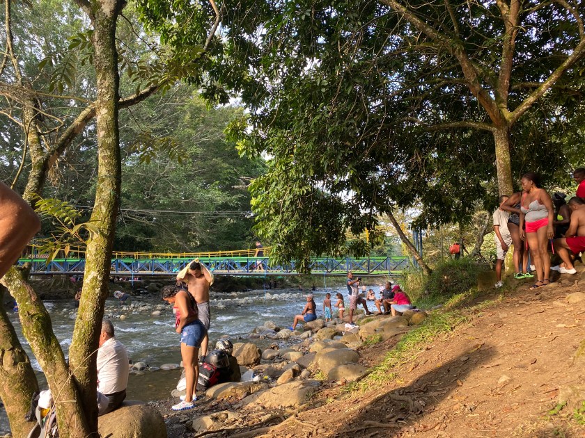 El baño en este lugar popular y muy concurrido, donde van las familias de Cali. El río tiene poco caudal, pero nos tumbamos y el agua nos cubre.