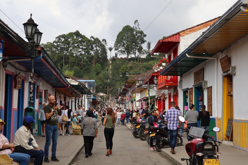 La alegría, los colores y la fiesta de este pueblo, uno de los más antiguos de Quindío. Paseamos por la calle principal que termina con una escalinata hasta llegar al Mirador de la Cruz. Está lleno tiendas muy concurridas.