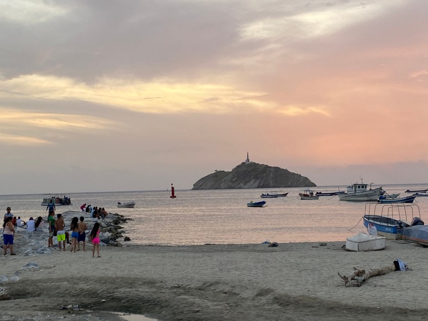 El atardecer en el pueblo de Taganga cuando llegan las barcas de los pescadores. Por las calles hay mucha animación de familias que pasean por el puerto.