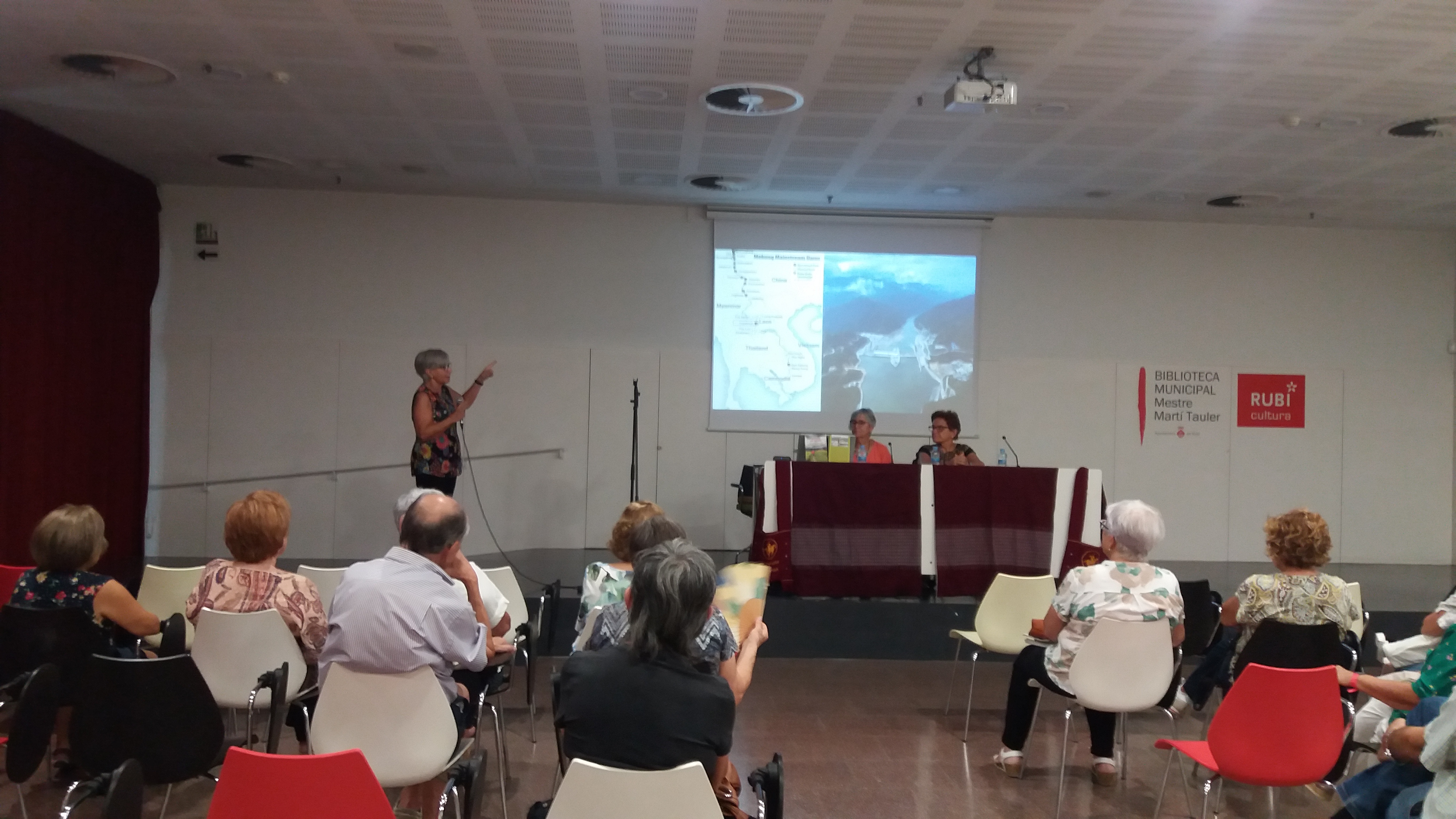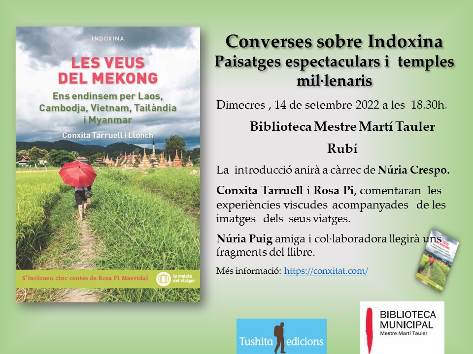 Avui  dimecres 14 de  setembre,  a la Biblioteca Mestre Martí Tauler de Rubí, ha tingut lloc  la presentació del  darrer llibre de viatges de la Conxita Tarruell “Las veus del Mekong” que ha comptat amb la presencia de l’autora i de la Rosa Pi, que ha escrit cinc  contes. L’acte ha anat  a càrrec de la Núria Crespo que ens ha introduït en la importància del riu Mekong  omnipresent al cicle de vida i mort dels més de setanta milions de persones que habiten a les seves riberes. Les autores han projectat una selecció de fotografies del seus viatges per la península d’Indoxina. La Núria Puig ha llegit un fragment d’un  conte que ha deixat als assistents  embadalits i amb la incògnita de saber com acaba.  Hi  ha hagut una bona concurrència de públic amb intercanvi d’experiències. Moltes gràcies a tothom!