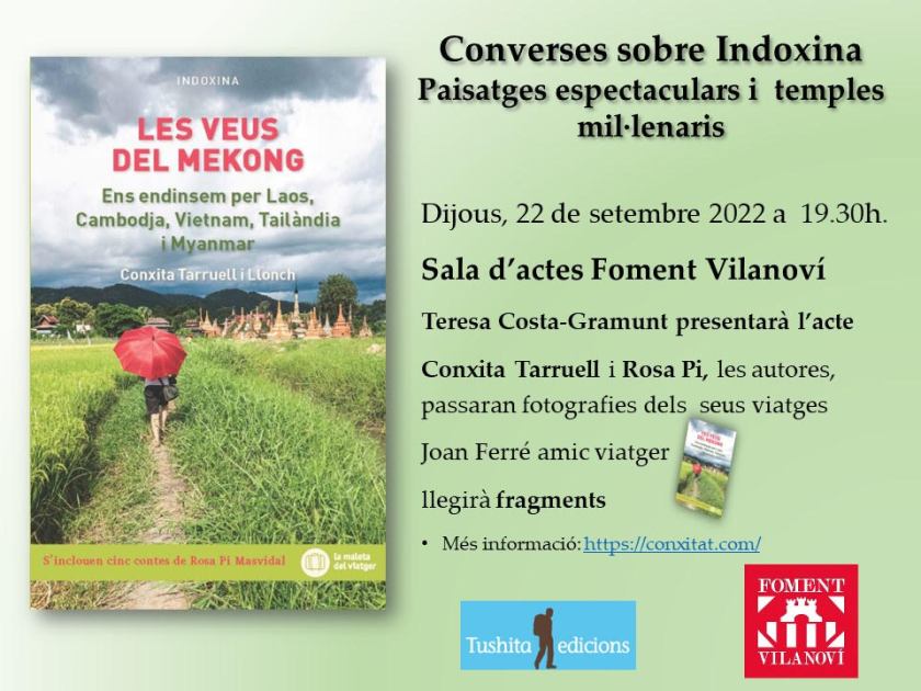 La sala d’actes del Foment Vilanoví va acollir el dijous 22 de setembre un púbic majoritàriament femení, que va despertar interès, generar il·lusions, caliu i ganes de viatjar. Vam tenir el goig de que ens acompanyés l’escriptora local Teresa Costa-Gramunt, que va parlar de l’article que va escriure a l’Eix diari sobre el llibre Les veus del Mekong. El Joan Ferré, amic vilanoví, va llegir fragments i contes que a ell li havien impactat. Contents de com va anar l’acte vàrem acabar celebrant i brindant amb una copa de cava.