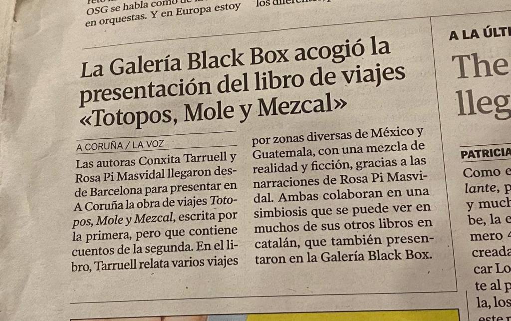 Presentar el libro Totopos, Mole y Mezcal y explicar los Viajes por México y Guatemala en la Galería de Arte Black Box A Coruña, ha sido un gran placer. Conversar con Jesús, Susana y otras amistades, nos ha llenado de alegría. En esta gira por Galicia, Conxita y yo damos un agradecimiento especial a José Eulogio Rouco por su acogida, gestión y acompañamiento. Ha sido una semana llena de descubrimientos de nuevos parajes, de disfrutar de paisajes bellos y de conocer mejor a los gallegos y sus tradiciones, tanto literarias, artísticas como musicales, danzas y gastronómicas. Un abrazo!