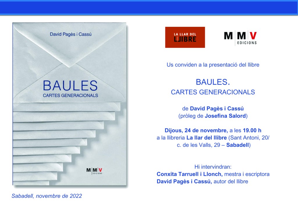El dijous 24 de novembre he presentat a l’escriptor gironí David Pagès i Cassú a la Llar del llibre de Sabadell. És llicenciat en filologia catalana. El seu objectiu —com a docent, escriptor i dinamitzador cultural— ha estat sempre el de contribuir a donar a conèixer els Països Catalans, els seus atributs com a poble i els seus grans homes i dones. Ens vàrem conèixer el juliol de 2022, a l’Escola d’Estiu del Col·legi de Llicenciats, en el curs que vaig impartir sobre “Connectem l’escriptura amb les emocions”. Quan em va demanar d’intervenir en la presentació, vaig estar buscant informació sobre el seu recorregut literari. He quedat admirada de la quantitat de llibres que ha escrit. El fil conductor de Baules és el de fer més propers, a partir d’unes cartes escrites per descendents i estudiosos, persones il·lustres d’arreu de les terres de parla catalana que ens han precedit. Ha estat un acte ben entranyable!