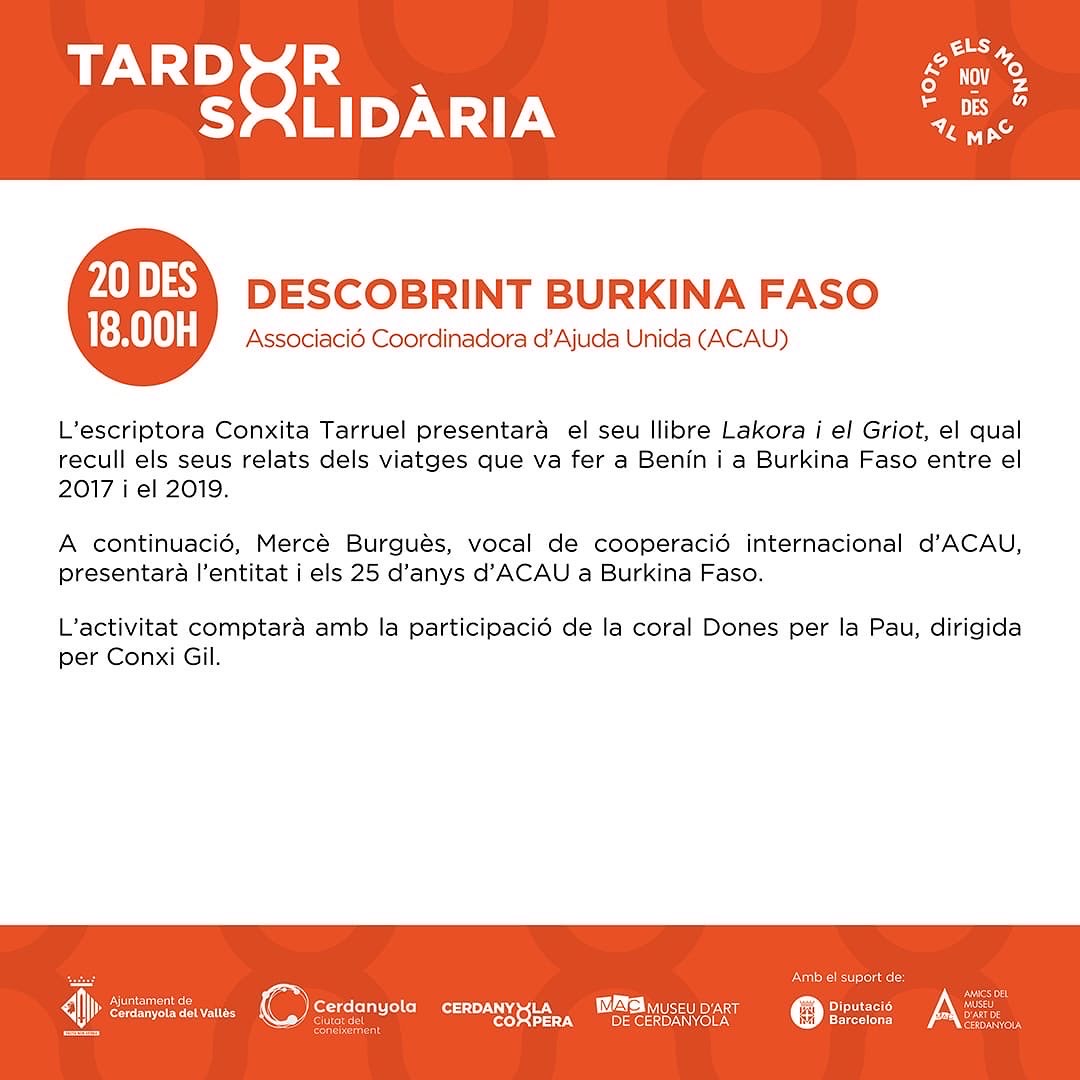 El dimarts 20 desembre al Museu d’Art de Cerdanyola ens han convidat per celebrar el 25è Aniversari de l’ong ACAU. Mercè Burgués ha passat un vídeo de tots els projectes que han realitzat durant aquests anys a Catalunya i a Burkina Faso. A continuació han actuat la Coral Dones per la Pau dirigida per Conxi Gil i acompanyada al piano per Arnau Ferrer, que han amenitzat l’acte amb cançons nadalenques. Conxita Tarruell i Rosa Pi han parlat del llibre La Kora i el Griot i han passat imatges de les experiències a Burkina Faso, que han comentat junt amb la Mercè. Ha estat una vetllada festiva per commemorar aquest treball de voluntariat per fer un món millor.