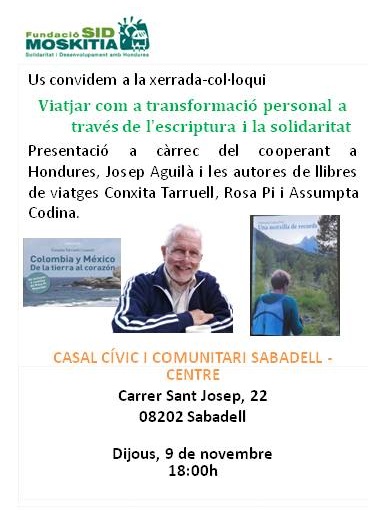 Ha iniciat l’acte la Gabriela, responsable del centre cívic, a continuació el cooperant Josep Aguilà ens ha parlat de la seva tasca a Hondures durant més de trenta anys. Ha estat molt enriquidor. Tot seguit l’Assumpta Codina ens ha explicat les seves experiències a Xile que surten reflectides en el seu llibre autobiogràfic. En acabar la Conxita i la Rosa han fet un recorregut de tot el procés de l’escriptura a través dels viatges i els contes ambientats en aquests països.