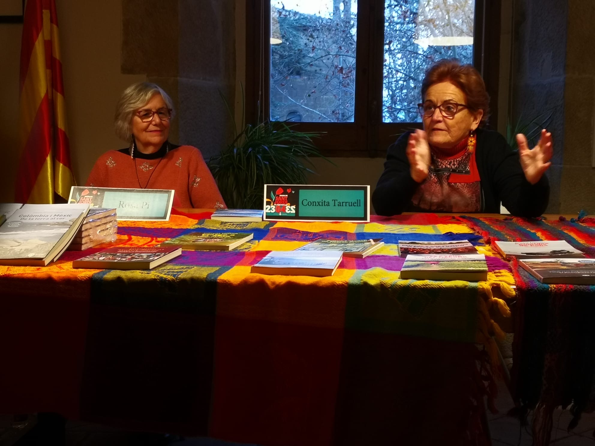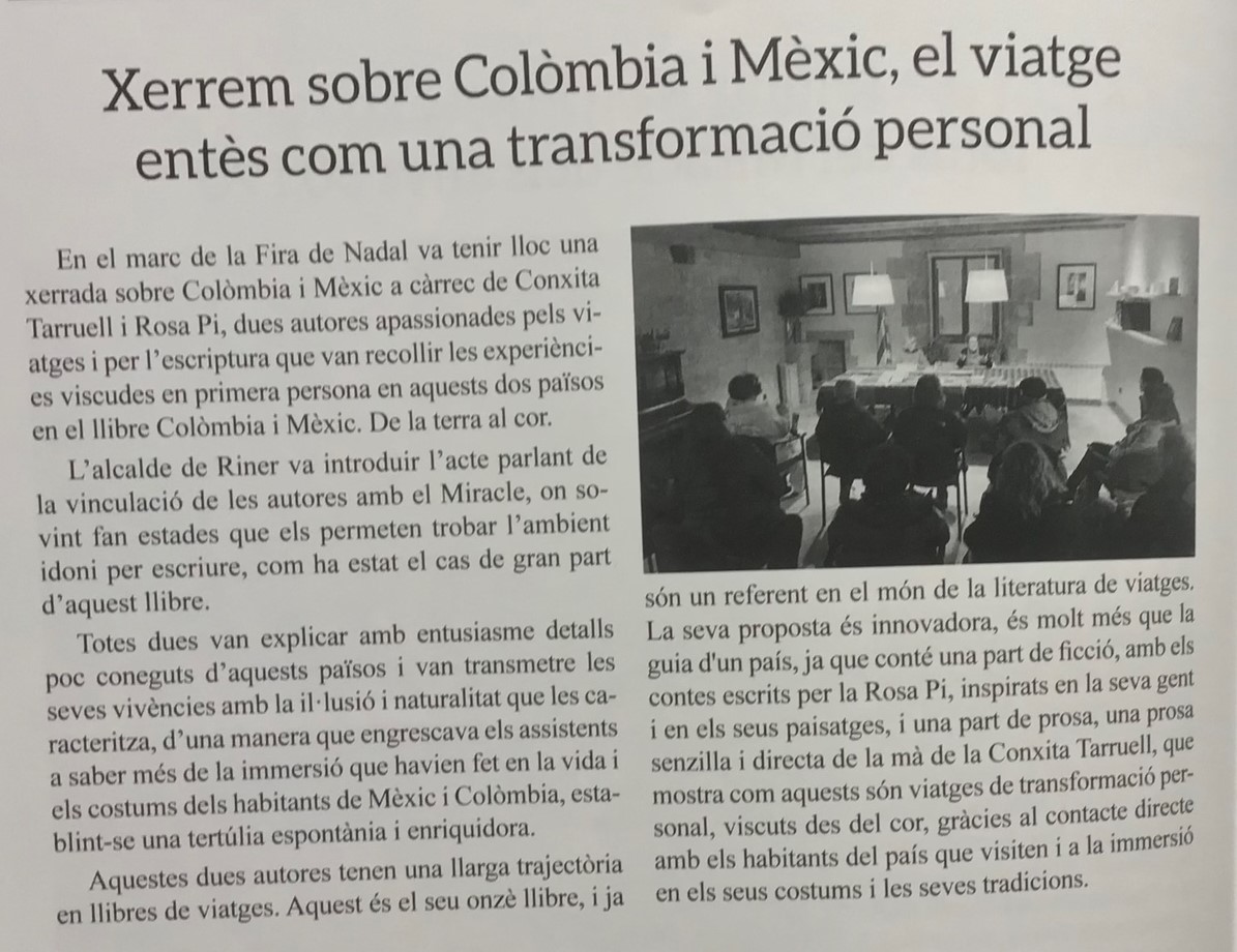 Ha introduït l’acte l’alcalde de Riner, Joan Solà, que ha parlat de la vinculació de les autores amb El Miracle on ha estat escrit part del llibre. A continuació Conxita ha parlat de la trajectòria dels llibres de viatges fins a l’onzè que és el que avui es presenta. La Rosa ha parlat de la seva experiència en escriure contes dels viatges i cadascuna ha llegit alguns textos de Colòmbia i Mèxic. Els assistents han participat amb interès a la xerrada i s’han interessat pels llibres. Agraïm a la Regidora de Cultura Lourdes  Xixons  que ha fet possible que aquest acte hagi estat un èxit dins el marc de la fira de Nadal 2023