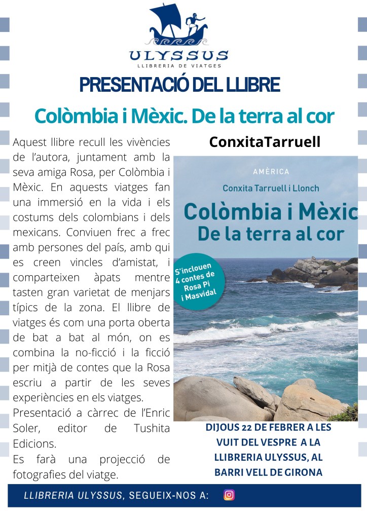 Ahir vaig estar a la presentació de la Conxita i de la Rosa; dues escriptores apassionades pel viatge i per l’escriptura. La seva manera de presentar el seu nou llibre, amb aquesta il·lusió i naturalitat que tenen per transmetre les seves vivències, contagia als espectadors a llegir: Colòmbia i Mèxic. De la terra al cor. Molta sort i èxit amb els vostres llibres, Conxita i Rosa. Que continueu així d’eixerides!