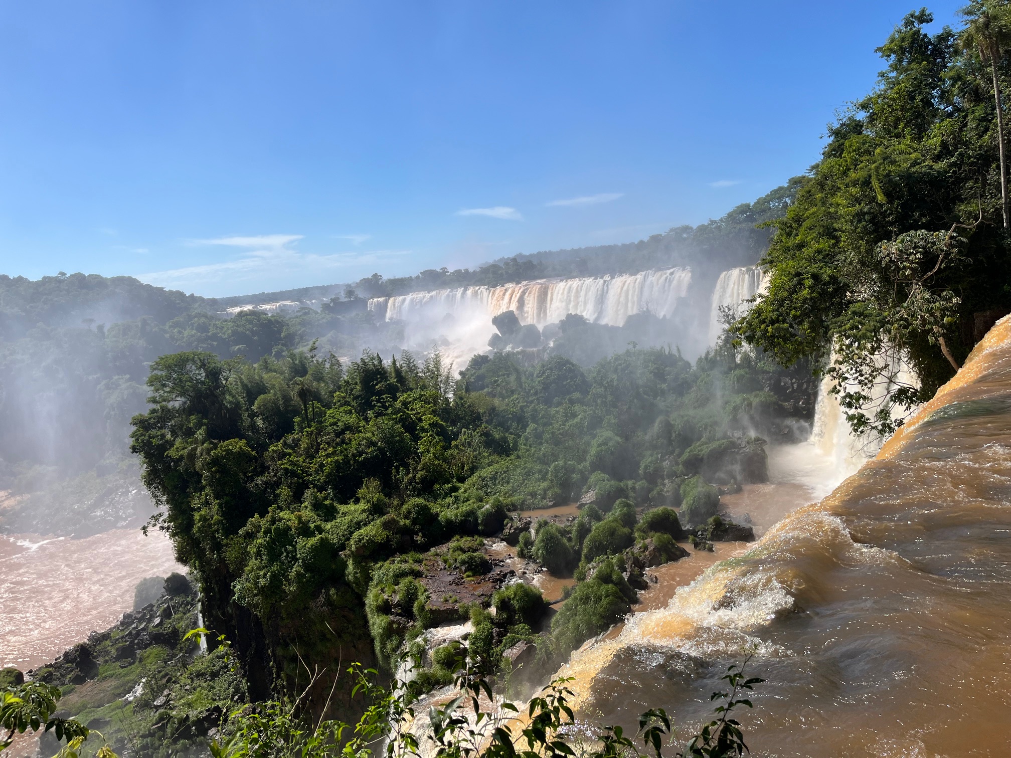 Les cascades de la part del Brasil al circuit de passarel·les d’uns mil metres de llarg, sobre els barrancs del riu Iguazú, on puc gaudir d’una vista panoràmica de tots els salts. El mirador del Salto del Diablo, on el soroll de la caiguda de l’aigua m’estremeix i quedo mullada per la força amb què cau la cascada.
