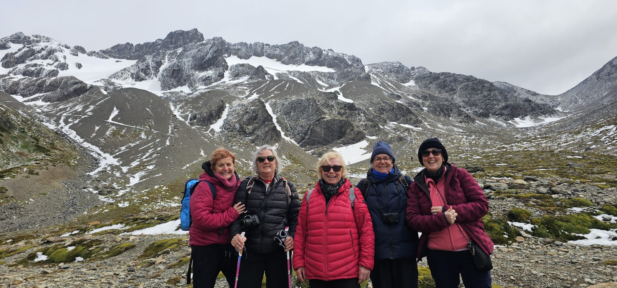 La glacera Martial,on camino enmig del bosc al costat del riu. En alguns moments hi ha plaques de gel i ens fa por relliscar, però entre totes ens ajudem i ens animem a seguir, motivades per arribar al peu de la glacera. Hem gaudit de les meravelloses muntanyes nevades. A la tornada hem baixat per l’antiga pista d’esquí amb vista sobre el canal Beagle i Ushuaia. Ens aturem a la Cabaña del Té per recuperar forces. Estem cansades però satisfetes.