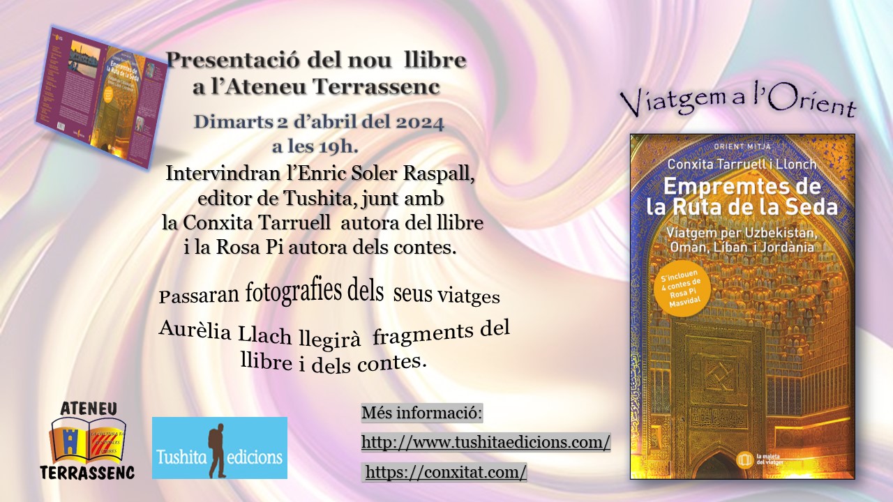 Ahir, 2/4/2024, presentació del llibre “Empremtes de la ruta de la seda”(Uzbekistan, Oman, Líban i Jordània), de la Conxita Tarruell i Llonch, amb contes de la Rosa Pi Masvidal, de Tushita edicions. Una sessió que em va obrir les ganes de visitar o re visitar aquests països, pel que son i em fan reviure. Recomanat el llibre pel seu bon segell de l’editor, i pel fet de compartir tan bones i interessants experiències vitals, socials, culturals i espirituals de les autores. Gracies Conxita , Rosa i Enric per fer-ho possible. Un llibre mes a la llista de la Maleta del viatger, amb aquesta empremta d’aventura i voluntat de conèixer i compartir. Gracies!!