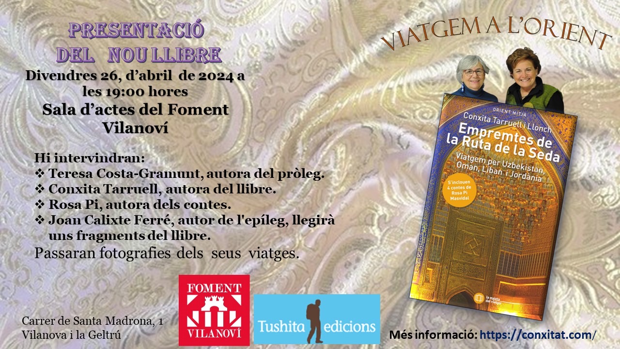 2. Teresa, vull expressar-te el meu sincer agraïment per haver-nos acompanyat al iniciar l’acte de la presentació del llibre ‘Empremtes de la Ruta de la Seda’, a Vilanova i Geltrú. Les teves paraules tan encertades sobre el viatge van ser molt valuoses per a tots. Aprecio molt la teva presència i els teus comentaris, els quals van enriquir encara més aquest moment tan especial.