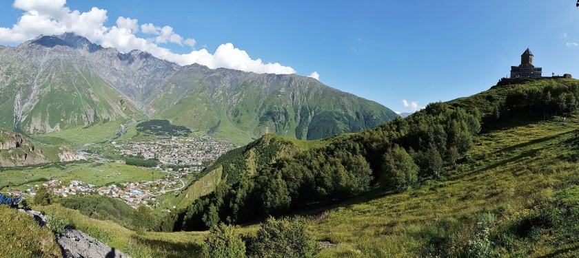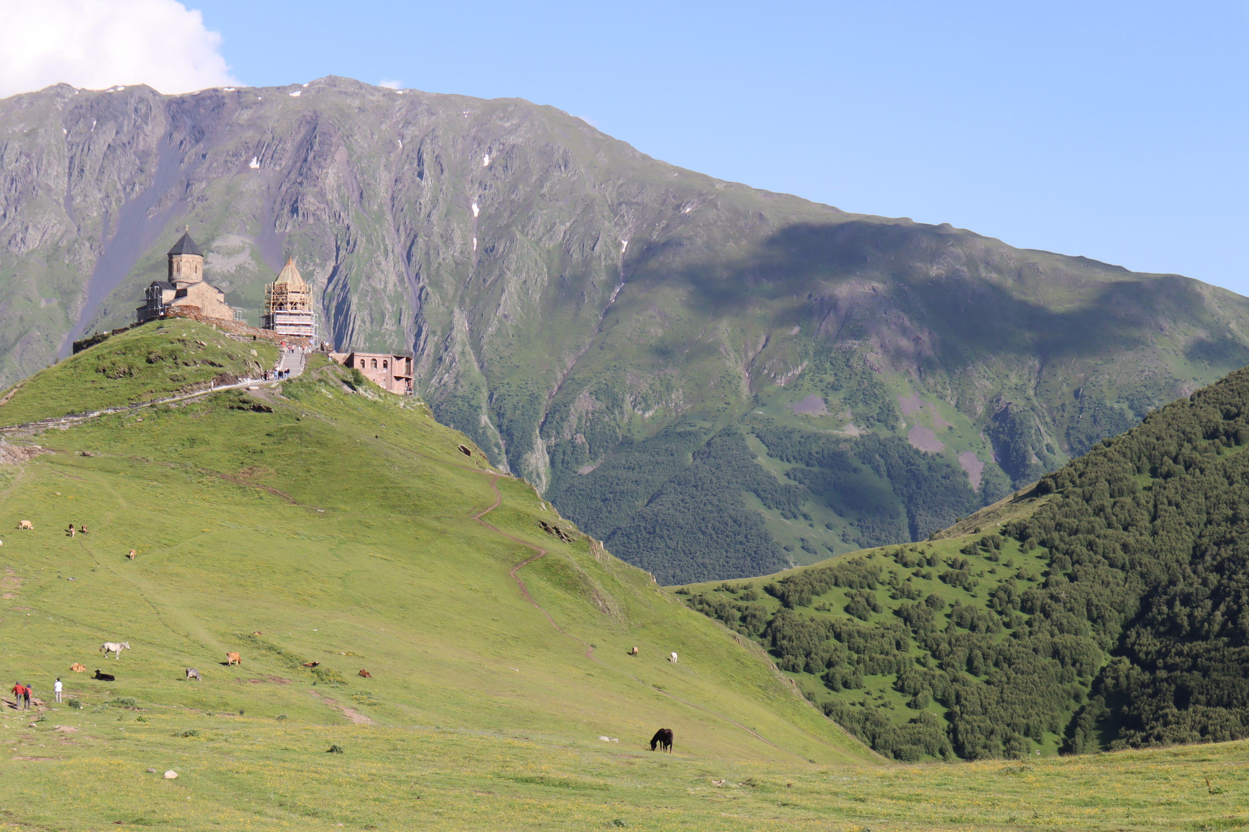 L’església de la Trinitat  situada a 2.170 metres d’altitud. El monestir, on viuen monjos, és un lloc de gran espiritualitat i bellesa. El recorregut des de Kazbegi ens porta a través de valls i boscos espessos. L’herba tendra dels prats contrasta amb les majestuoses muntanyes, mentre cavalls i vaques pasturen lliurement.