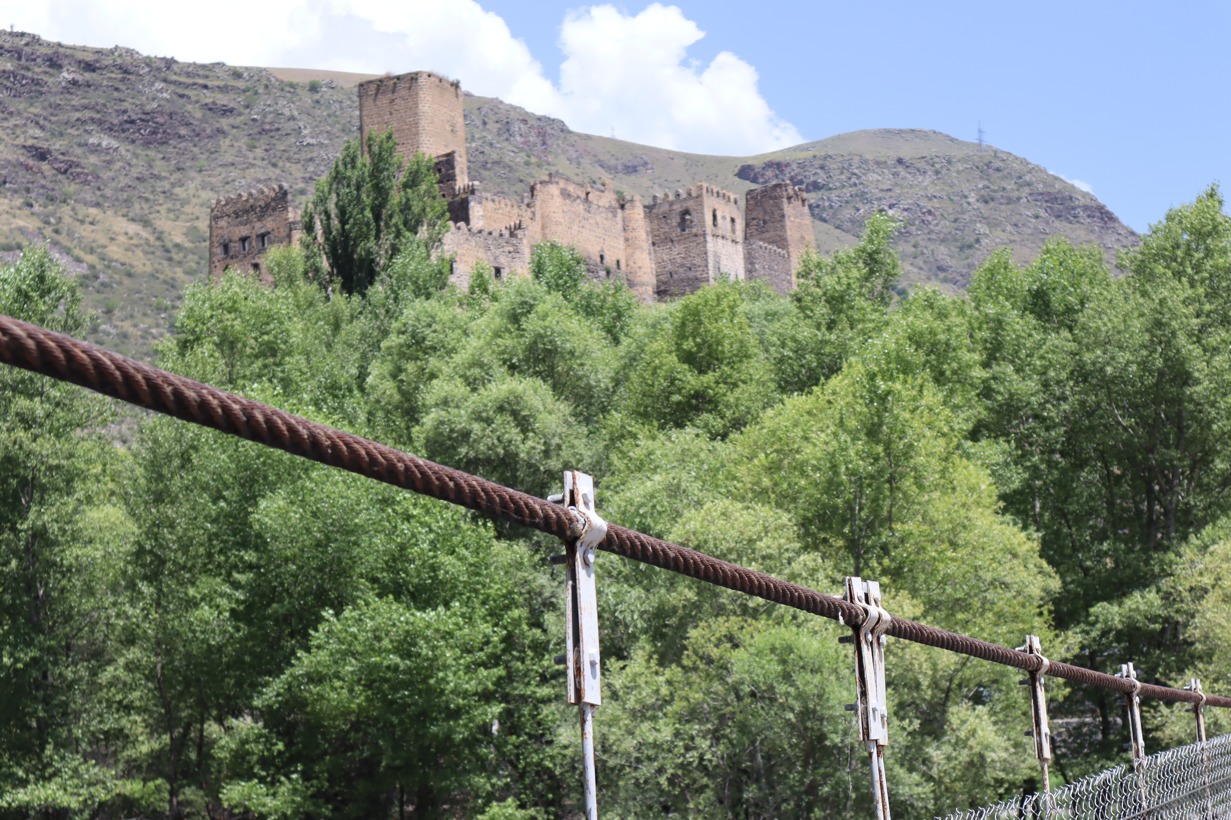 Les vistes des d’un pintoresc pont de fusta penjat sobre el riu Kura,  on capturo imatges de l’antiga fortalesa.