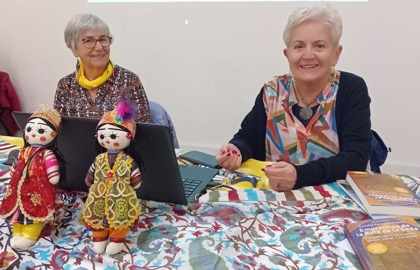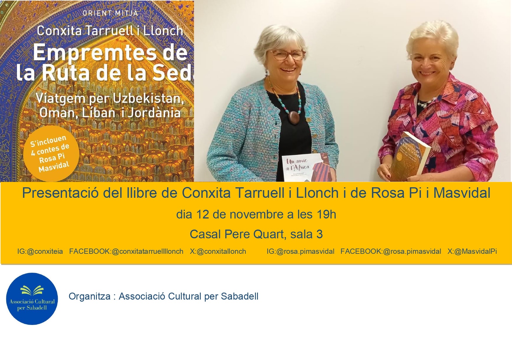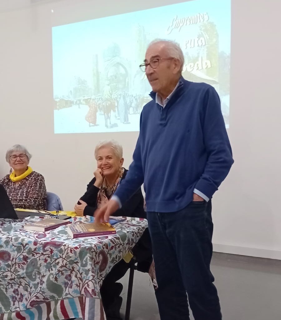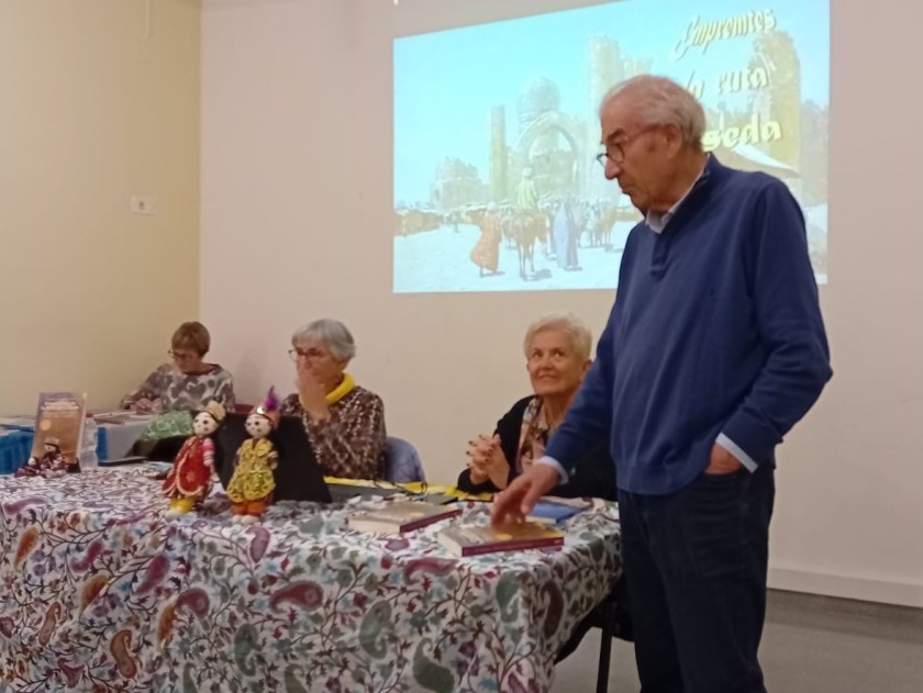 Avui hem tingut el plaer de participar a la presentació del llibre Empremtes de la Ruta de la Seda al Casal Pere Quart. Aquest és el dotzè llibre de la Conxita Tarruell, una obra que inclou quatre contes de la Rosa Pi, companya inseparable en viatges i aventures literàries. La complicitat entre elles és evident, i un cop més, han creat un tàndem que ens han fet gaudir de la seva col·laboració i de les vivències que comparteixen. La presentació, conduïda per l’Antoni Llorca, ha estat càlida i plena d’anècdotes que ens han fet somriure i que, a la vegada, desperten la curiositat per llegir el llibre. També hem comptat amb la presència de l’Esteve Barnola, gran fotògraf, qui ha estat capturant cada moment d’aquesta trobada deixant un testimoni visual ple de vida i emoció. Els que ja coneixem els llibres de la Conxita sabem que ella escriu des d’una òptica de creixement i transformació personal. Ens parla de la seva experiència, de les emocions i dels sentiments que li han inspirat els seus viatges. La Rosa ens explica que els seus contes sorgeixen dels llocs i de les persones que coneix en cada viatge. Per a ella, la gent i la cultura de cada país són una font d’inspiració. En la seva escriptura, es barreja la realitat amb la ficció, per això busca personatges i els fa passar aventures, tot explicant-nos com és el país. La Conxita, per la seva banda, comparteix que viatjar li ha portat a conèixer molta gent interessant. Com ella diu sempre, les persones són el més important El fet d’ escriure i compartir aquests llibres de viatges la fa feliç.