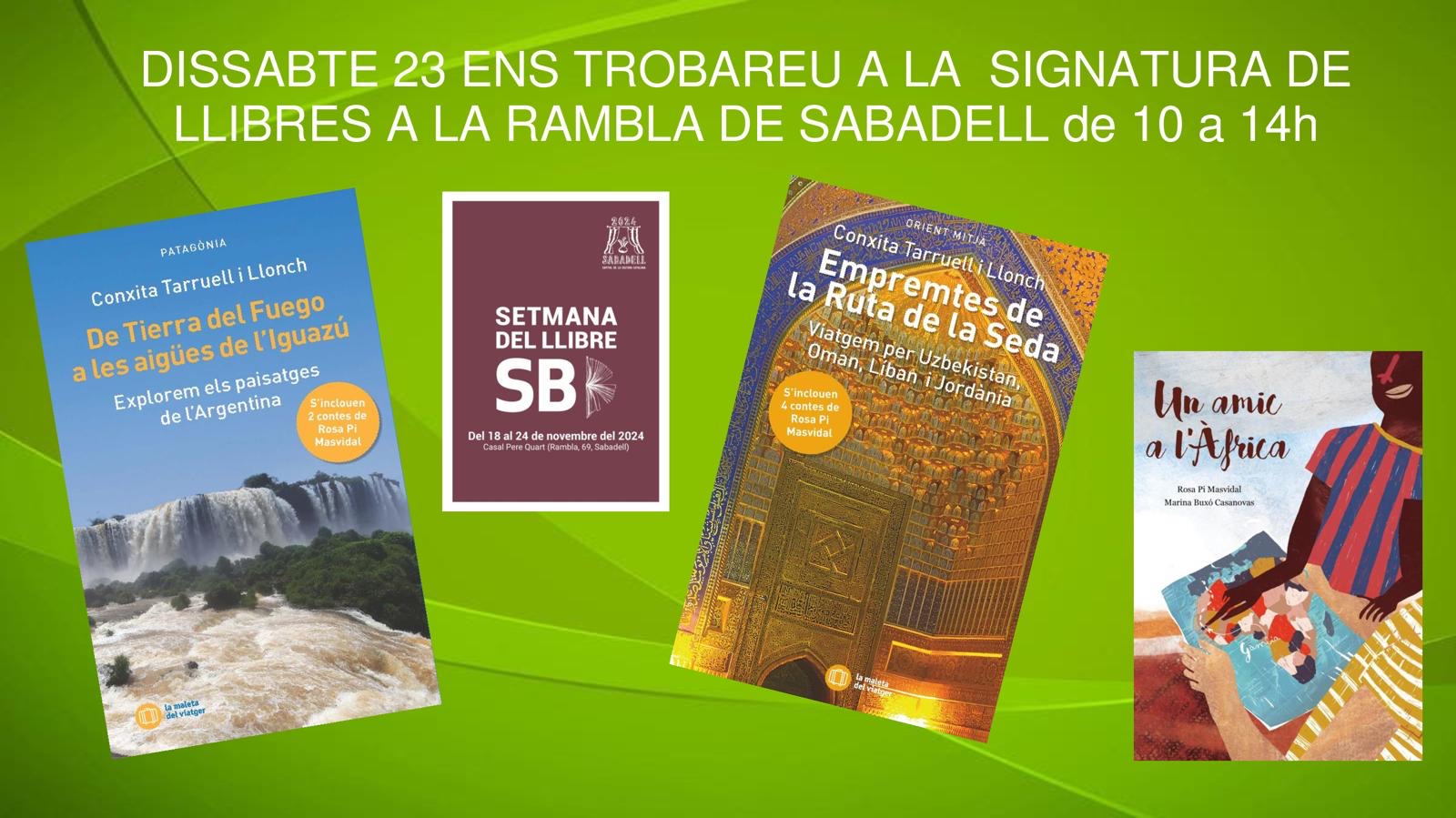 Hem assistit als actes de la setmana del Llibre SBD 2024. Ha estat plena de presentacions, conferències, música, lectures dramatitzades i molt més, amb la participació de personalitats literàries d’arreu i d’autors locals. Hem participat dijous 14 de novembre a la RODA DE PREMSA que han presentat la setmana i ens hem fet una fotografia amb els escriptors. I el dissabte 23 a la Taula de signatures d’autors locals a la Rambla de Sabadell, els llibres: Empremtes de la Ruta de la Seda (2024), De Tierra del Fuego a les aigües de l’Iguazú (2024) i el conte Un amic a l’Àfrica (2024). He estat acompanyada de Rosa Pi, autora dels contes i Agustí Bartolomé, il·lustrador. Ha estat molt concorregut i s’ha respirat un ambient festiu. Compartir les experiències amb altres autors ha estat enriquidor.