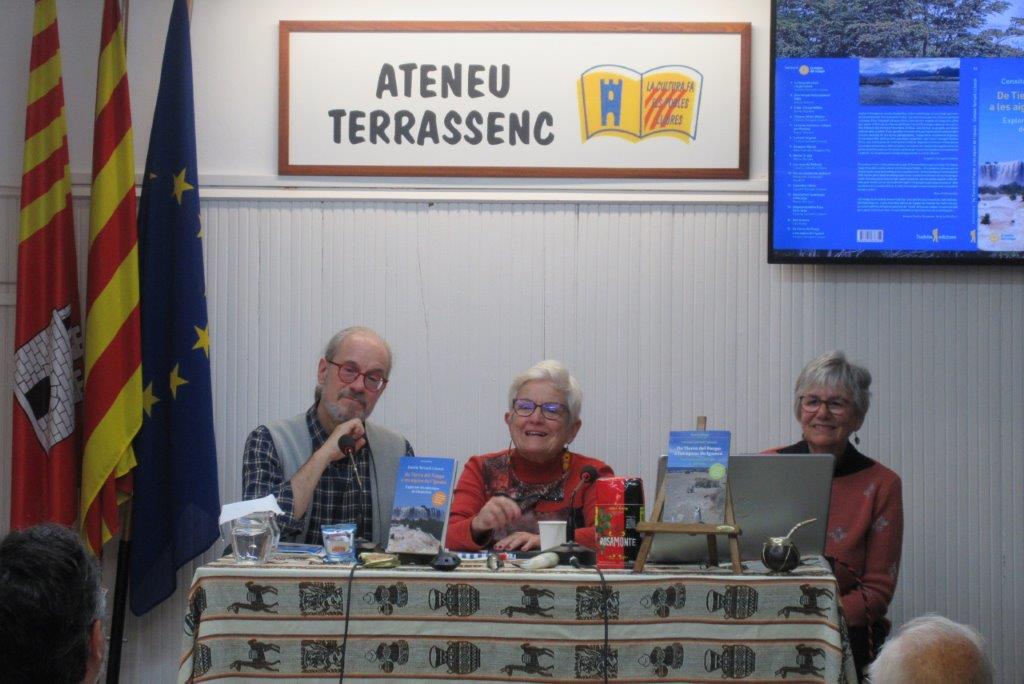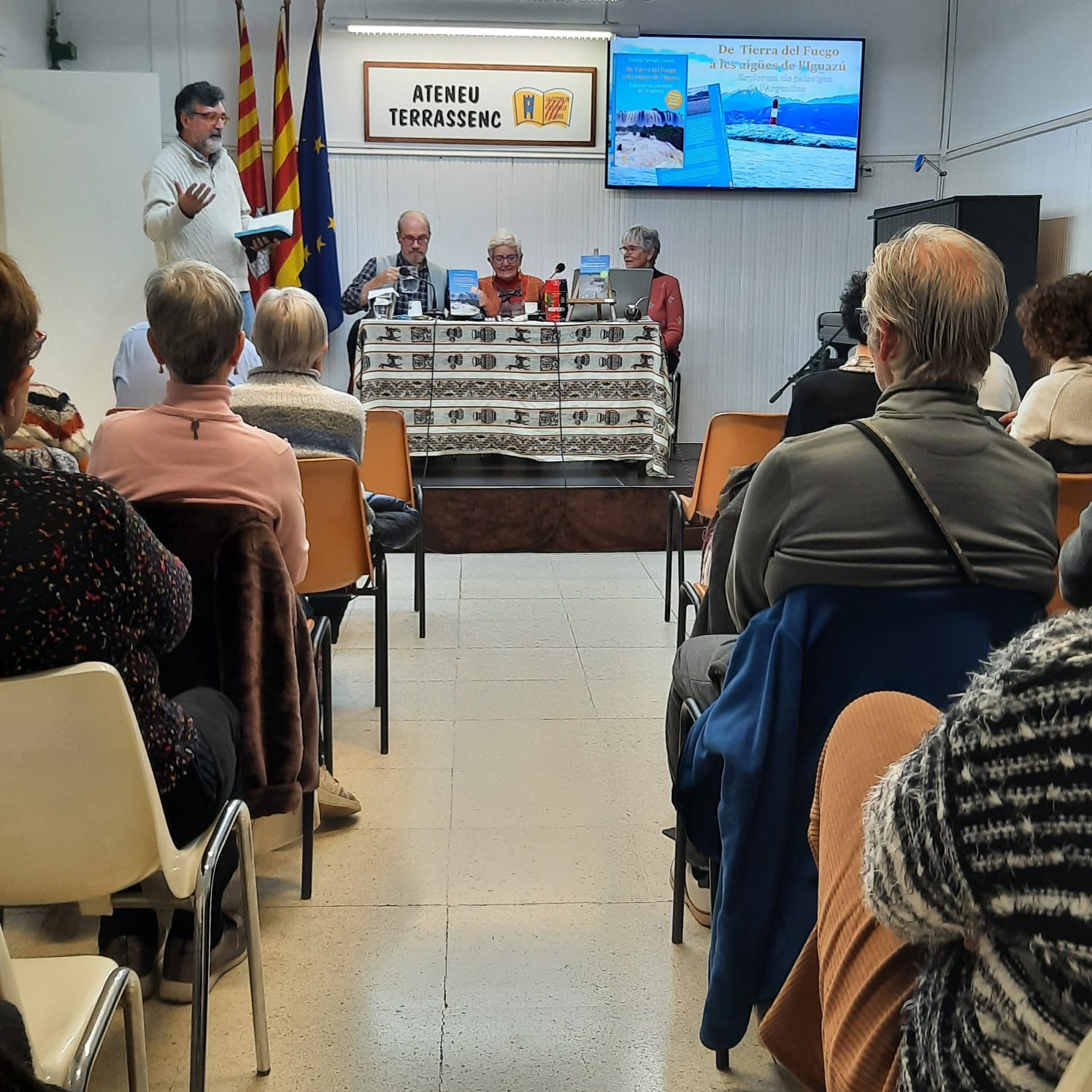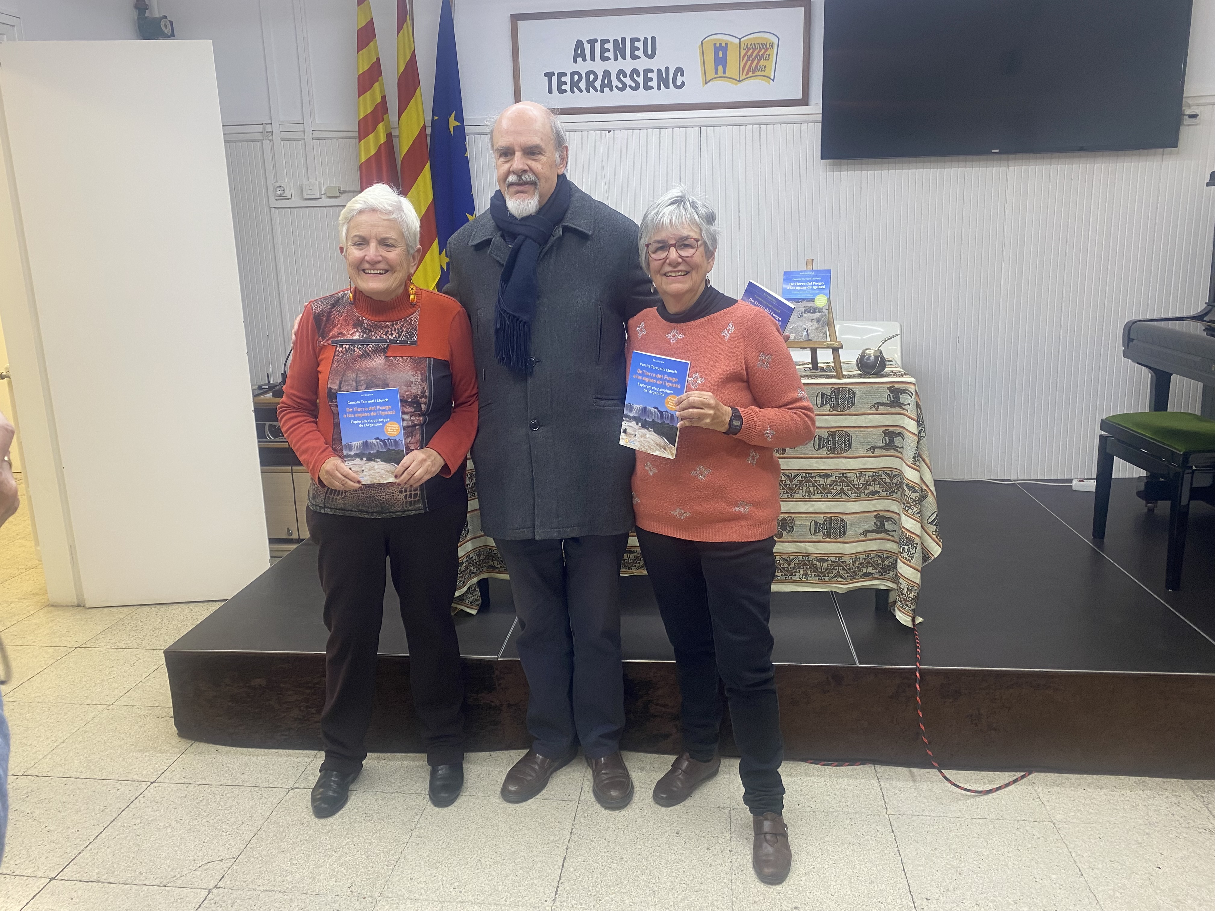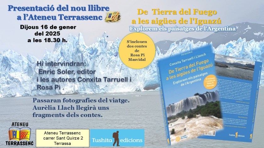 El dijous 16 de gener, l’Ateneu Terrassenc s’ha omplert d’energia i curiositat per la presentació del llibre De Tierra del Fuego a les aigües de l’Iguazú, publicat per Tushita Edicions. de Conxita Tarruell i Llonch amb dos contes de Rosa Pi Masvidal. L’acte ha començat amb la càlida benvinguda de Jordi Torres, membre de la Junta Directiva de l’entitat, que ha destacat la rellevància de l’esdeveniment. A continuació, Enric Soler Raspall, editor del llibre, ha pres la paraula per presentar les autores i detallar el procés de creació d’aquesta obra tan especial. Les protagonistes, Conxita i Rosa, han captivat l’audiència amb el relat de les seves vivències durant el viatge, enriquint les seves paraules amb fotografies que transportaven els assistents a la Patagònia i les espectaculars cascades de l’Iguazú.L’Aurelia Llach ha captivat els assistents llegint fragments de contes que han fet volar la imaginació dels presents: des de la bulliciosa colònia de pingüins de la Península Valdés, on el so de les ones es barreja amb el xivarri dels ocells marins fins a les inquietants aigües del llac Nahuel Huapi, on l’enigmàtica presència del monstre Nahuelito ha fet intrigar als públic amb un toc de terror i fascinació. L’esdeveniment ha comptat amb una gran assistència de públic, que ha mostrat interès pel llibre i les experiències narrades, també ha participat amb preguntes i han compartit impressions en un ambient agradable.